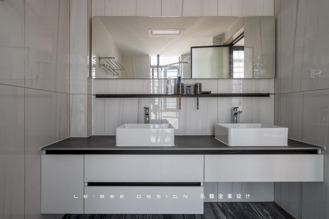 主衛選擇雙臺盆設計,方便業主二人同時使用,臺上盆美觀程度更高,也能防止水花外濺。浴室柜選擇墻排的形式,減少主衛衛生死角。