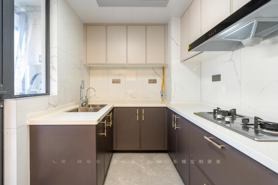 U字型布局,高雅的白棕配色,輕盈又穩(wěn)重。臺面設計根據洗、切、炒的人體工程學進行規(guī)劃,省心的廚房設計能給下廚帶來歡樂。
