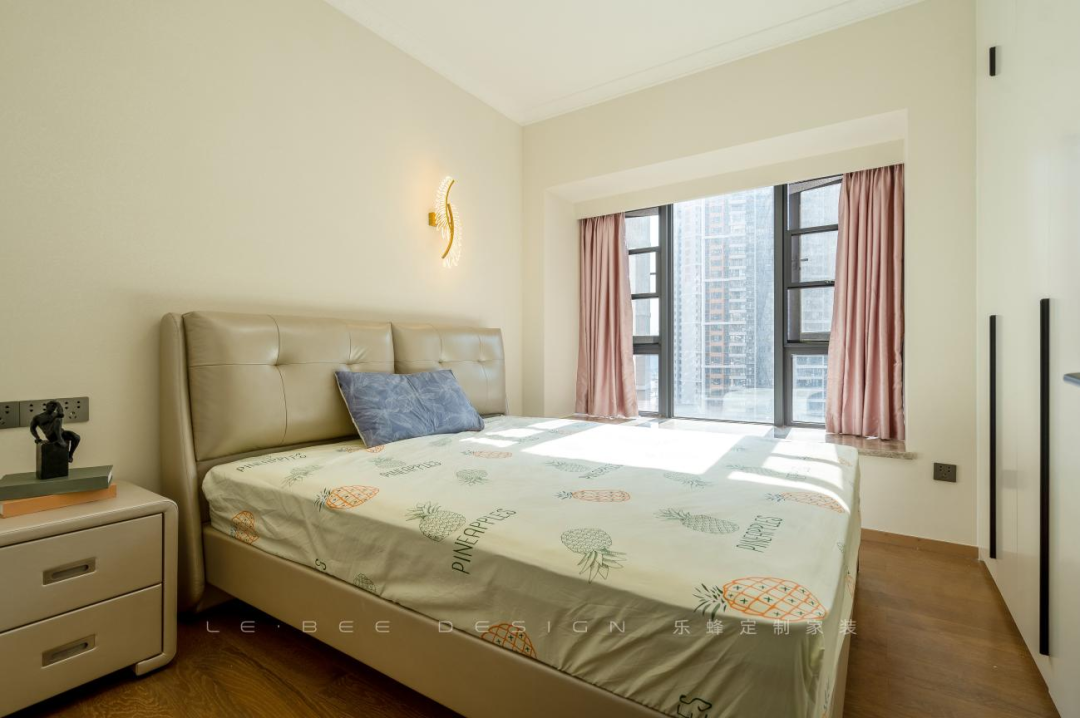 床尾設計的整面收納柜滿足了房間中的收納需求,寬敞大床配上床頭柜,功能齊全。