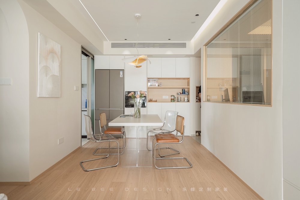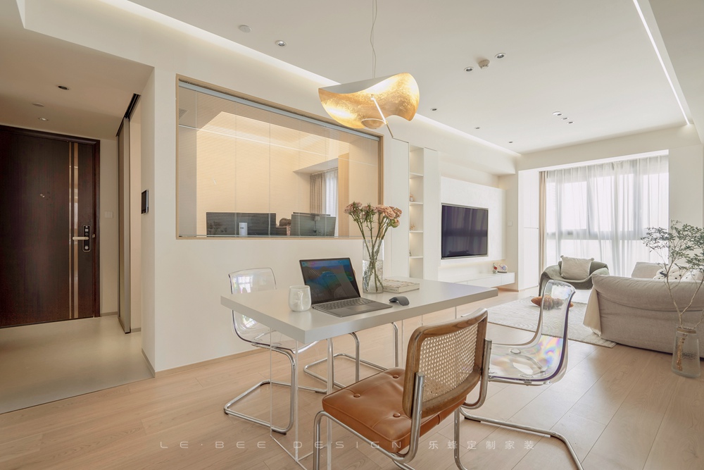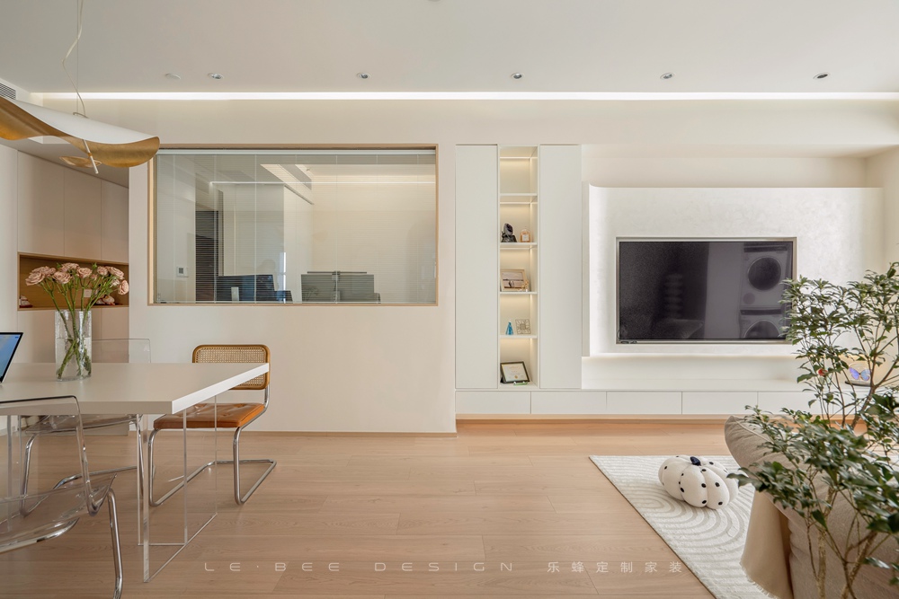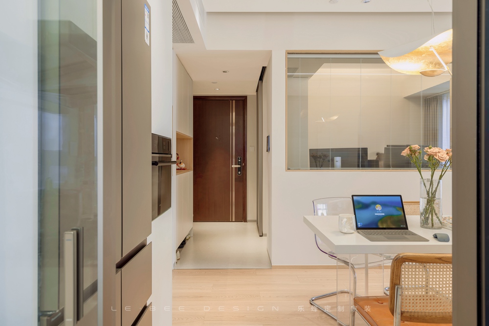 - 通過玄關區域望客廳書房,極簡的感覺油然而生。極簡的白搭配溫潤的木,整個空間干凈又溫柔。