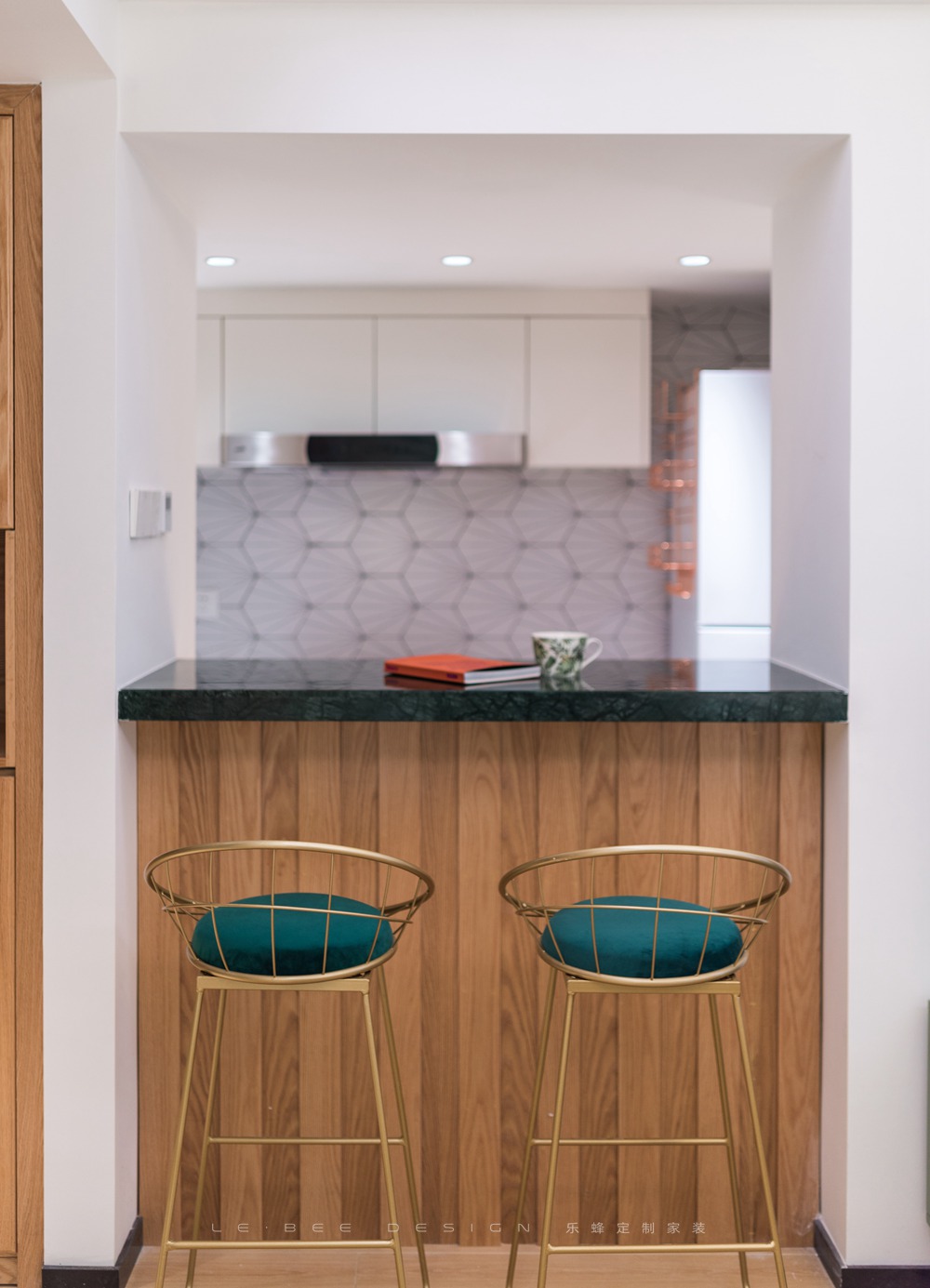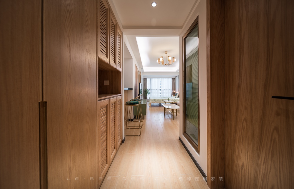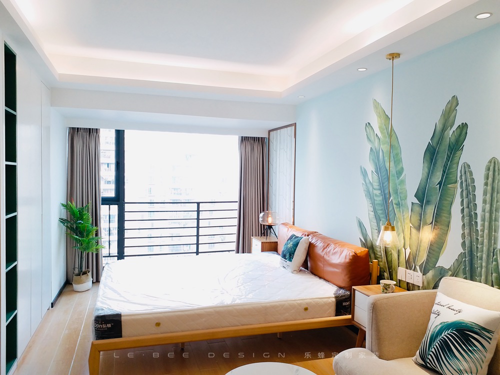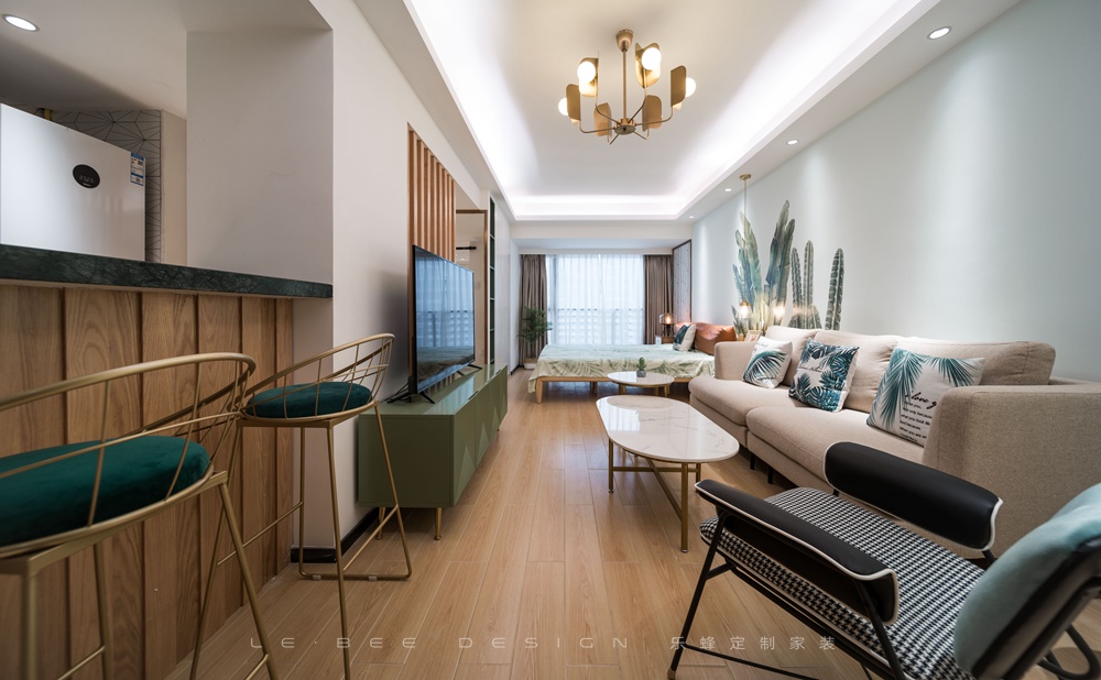 借著陽光的愜意,墻面綠植背景營造出一片與大自然共融的宜居之地,使整體空間顯得素雅而生動,空間雖小,卻功能性齊全。干凈的的布藝沙發,圓形的鐵藝茶幾,簡約的吧臺,構筑成幾何美感,安詳和睦。原木線條與書房隔開及餐臺形式讓廚房也能滿足光線照射到屋內。清透的藍,一片片銀白,還有那悠悠的綠,仿佛身處山中的松林,整體風格考慮業主喜歡去到處去旅游,風格元素采納大自然的元素