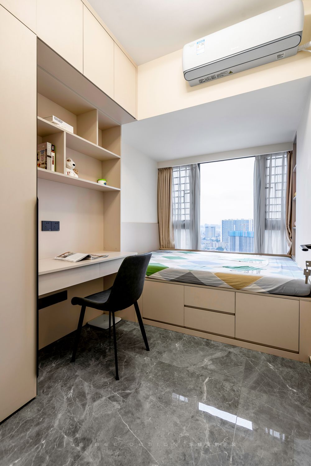 - 兒童房實景圖 - 兒童房設計為榻榻米的形式,一次性解決睡眠、收納和書桌需求。房內選擇溫馨柔和的米色進行設計,睡眠區充分利用了飄窗,節省了兒童房內部的空間。