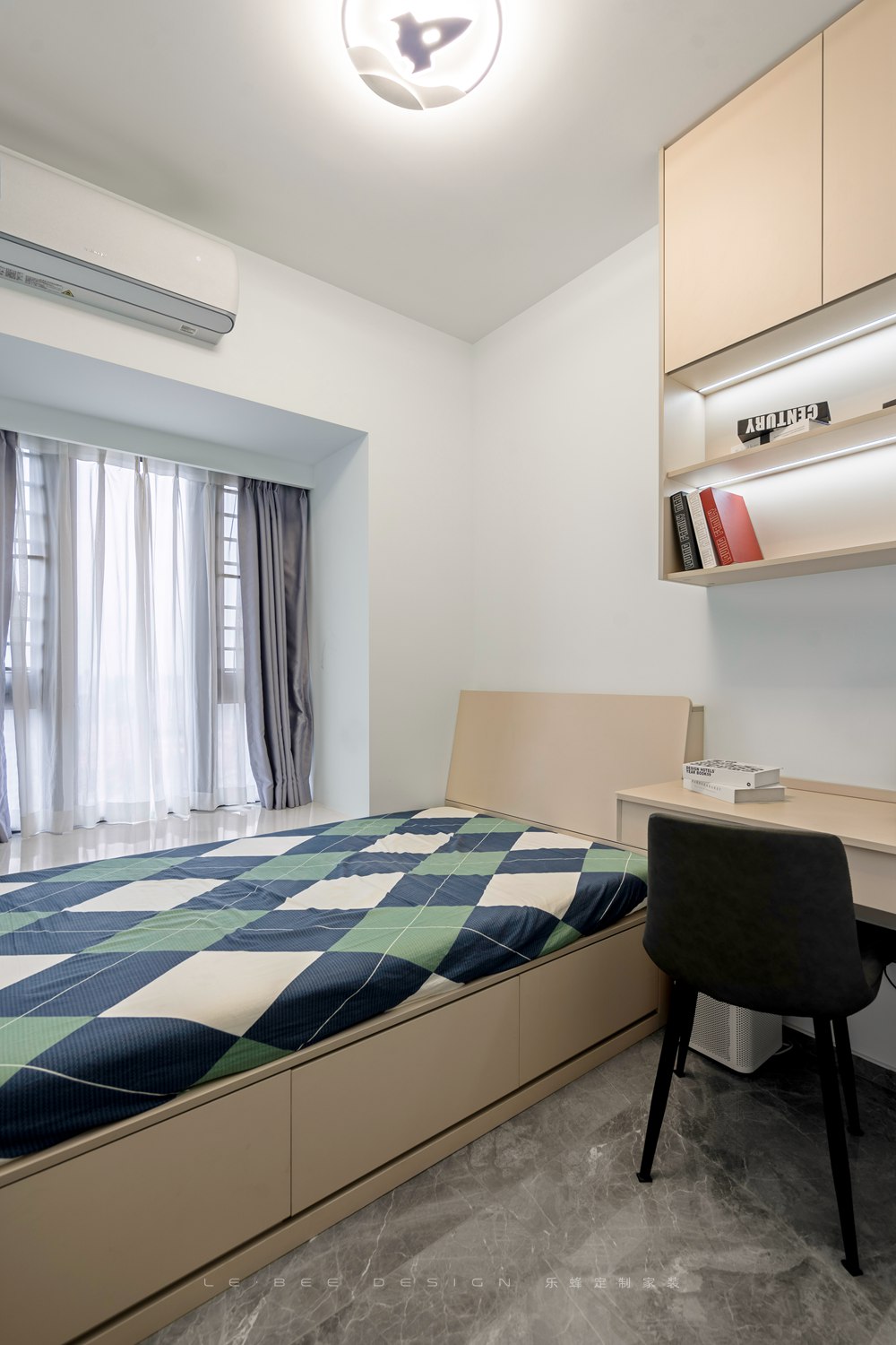 - 次臥實景圖 - 次臥設計為客房,因此布局簡單,設計了睡眠區、辦公區和一部分的收納,對于不常住的家人朋友來說,這樣的布局已經足夠了。