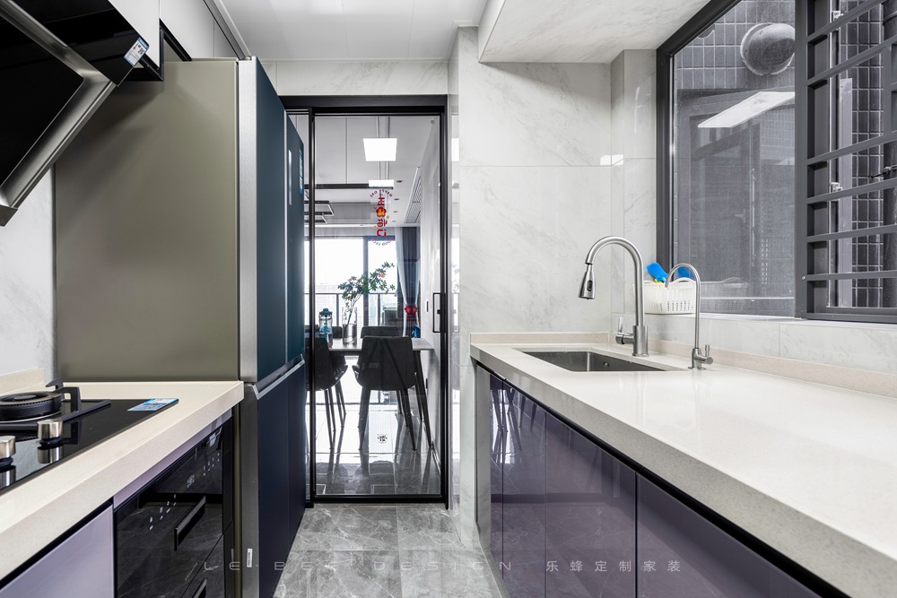- 廚房實景圖 - 廚房巧妙利用空間格局設計了U字型操作臺,最大程度利用了廚房空間。利用紫白配色打造高貴低調的風格,舒心的莫蘭迪色系搭配,讓下廚都變成一種享受。櫥柜的設計留有了冰箱的位置,冰箱內嵌,并不顯突兀,洗菜做飯也更加便利,不需要占據餐廳的空間。
