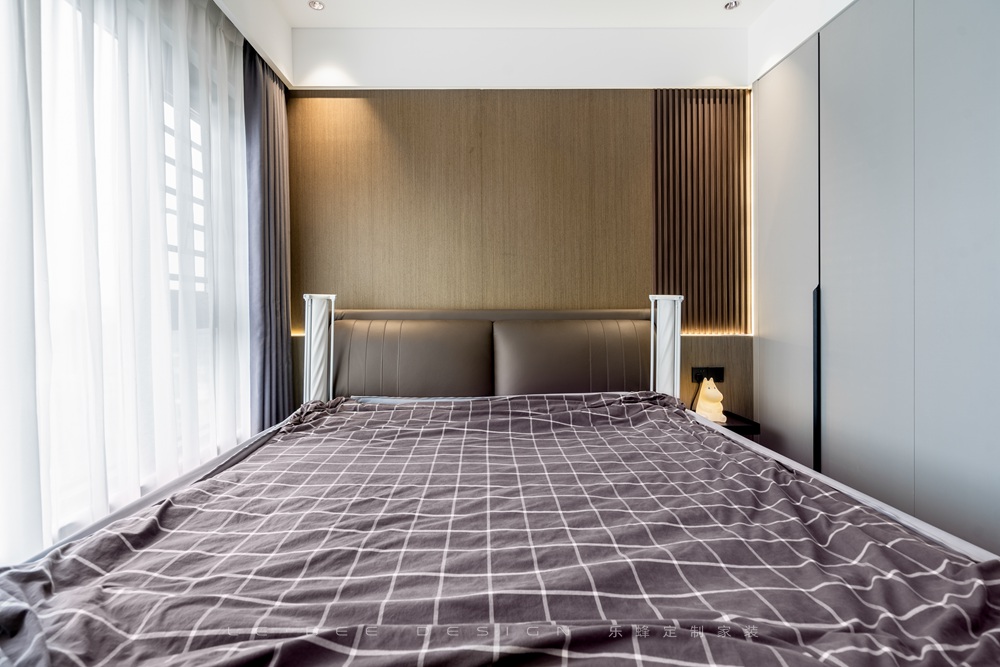 - 主臥實景圖 - 主臥的設計更加素雅,利用了淺灰色和原木色打造成熟和高級感。床頭設計了木飾面和木格柵的背景,簡約卻不單調,除此之外也設計了墻裙,將燈帶內嵌其中,給主臥營造溫馨的氛圍感和安全感。