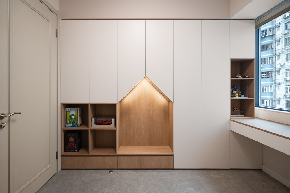 采用原木系與簡約白色的設計風格,讓書房更有自然與現代感。進門左邊的書柜采取防塵設計,讓清潔更加容易。而書柜下方則設計為擺設空間,讓書柜更具趣味性。另外,書房的電腦桌是業主進行設計制圖的理想場所。
