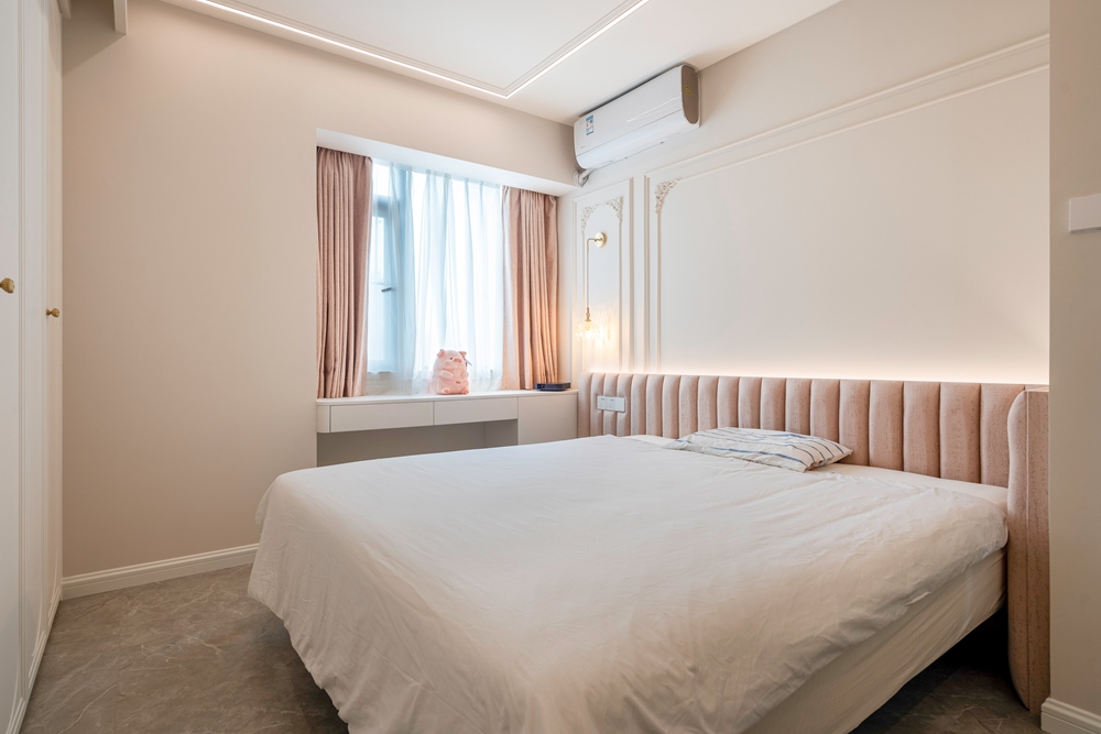 主臥室以粉色為主色調,床頭采用粉色軟包背景墻,法式床頭燈和背景墻燈帶給你更加優雅舒適的感覺。床頭兩側均配有插座,方便您充電使用。簡約的法式衣柜右邊設有玻璃柜門,里面設計了暖色調的柜燈提高了掛衣服的儀式感。