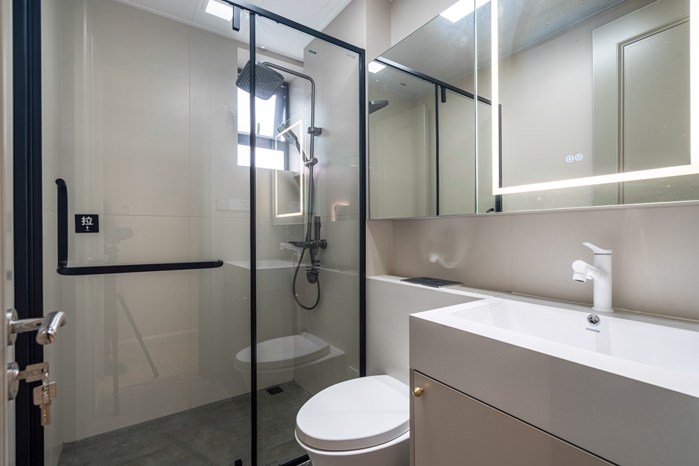 采用現代化的干濕分離設計,洗漱區和淋浴區分別設置,給視覺上帶來更多層次感。同時,黑色邊框玻璃三門設計也增加了空間的寬敞感。整個衛生間的設計也相當注重衛生便利性,懸浮馬桶、洗漱臺等設計讓打掃更加方便,而極簡白色水龍頭則增加了衛生間的整體質感。智能觸摸燈光更是讓護膚及清潔更加出色。