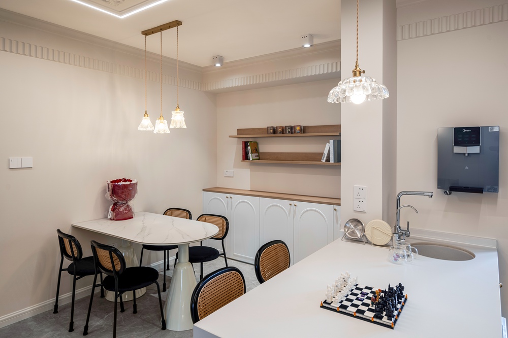 在餐廳就餐區,你會被迷人的法式暖光吊燈所吸引。簡約的白色巖板餐桌配上黑棕色椅子和鮮花裝點更顯氛圍。法式餐柜收納用途多樣,柜面采用原木系,墻上的原木色置物架可供放置喜歡的書籍,休閑時看上一眼。墻上還額外設計了多個插座,方便你使用電器或者在用餐時給手機充電。
