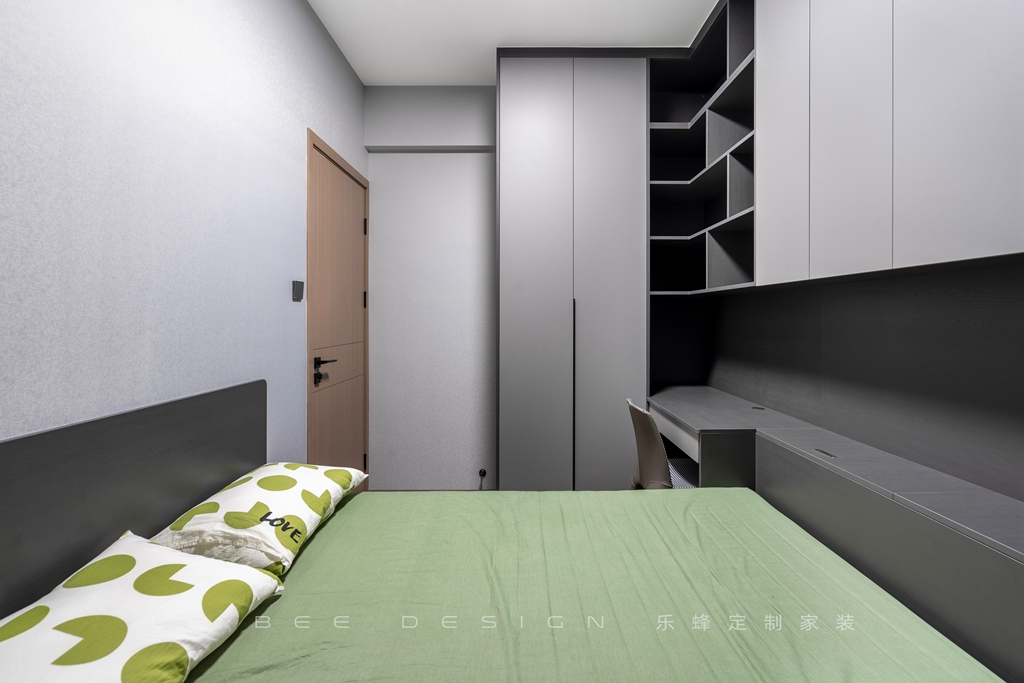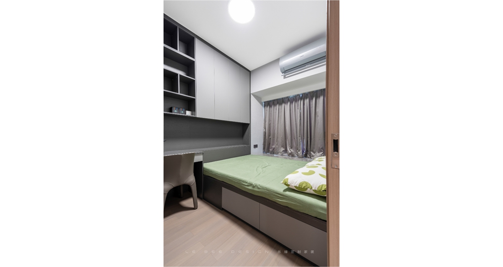 多功能房采用了榻榻米床的設(shè)計(jì),被單和枕頭都選用了綠色,為整個(gè)房間增添了趣味和生機(jī)。床尾設(shè)計(jì)了一個(gè)帶有儲物功能的柜子和一套桌椅,這里可以用來學(xué)習(xí)和辦公。旁邊還設(shè)計(jì)了一個(gè)衣柜,可以簡單地存放衣物。