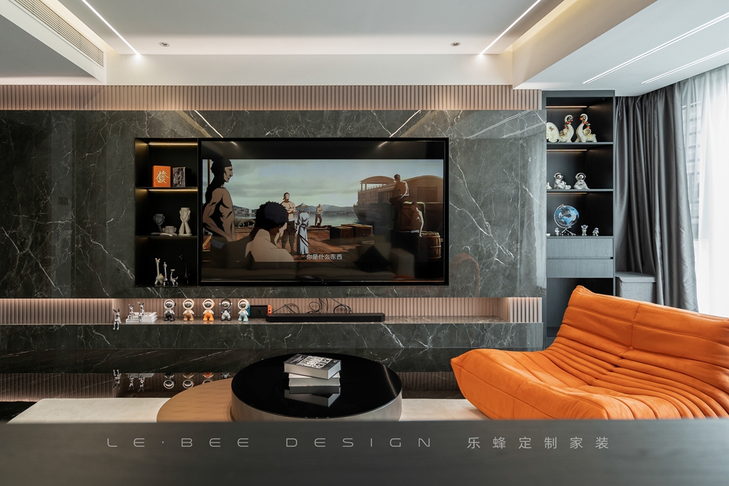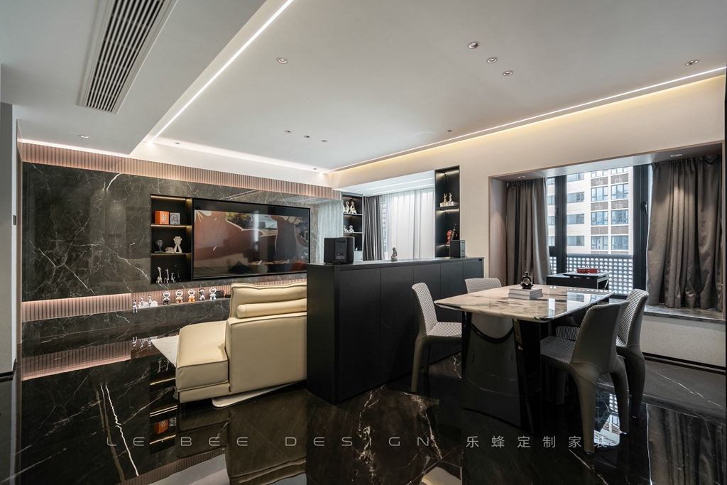 客廳沒有主燈設(shè)計(jì),采用了光亮的黑色地板磚作為地面裝飾。電視機(jī)被嵌入在電視背景墻中,左邊還設(shè)計(jì)了一個(gè)隔板用來擺放裝飾物件,墻面采用大面積的黑色大理石裝飾。上下搭配原木欄柵電視背景墻右邊則設(shè)計(jì)了裝飾柜,背景墻和凹凸有序的背景墻相互呼應(yīng),給人一種層次感強(qiáng)烈的視覺效果。