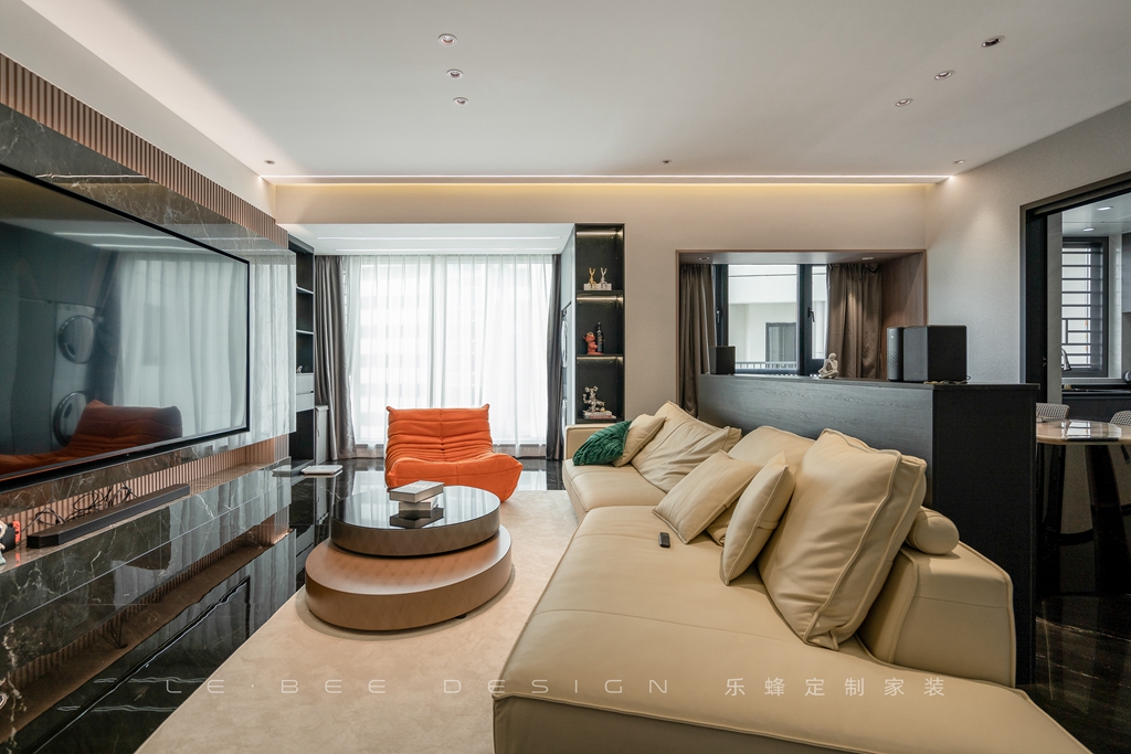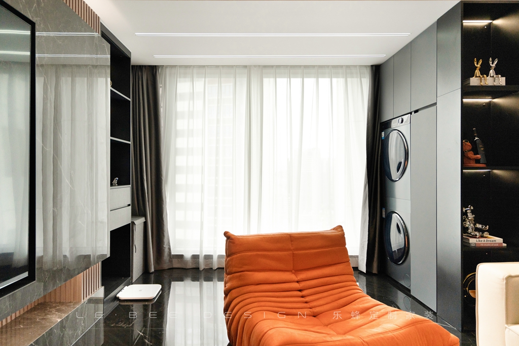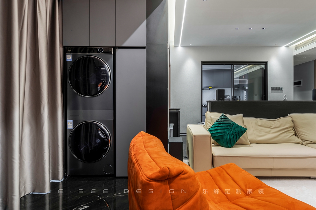 陽臺與客廳打通,嵌入式的洗烘機(jī)和黑色收納柜被設(shè)計(jì)成嵌入在客廳的柜臺上,柜面的設(shè)計(jì)沒有柜門,用來裝飾和陳列擺件,給整個(gè)空間增添了一份別致的韻味。