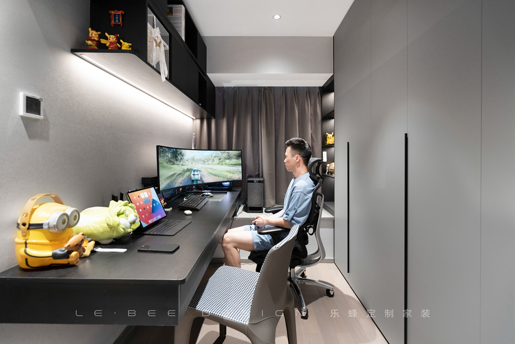 主臥的衣帽間不僅僅是一個(gè)簡單的存放衣物的空間,設(shè)計(jì)師巧妙地利用左側(cè)空間布置了一個(gè)辦公地,懸空的桌子上方還設(shè)計(jì)了高柜,可以存放書籍或裝飾擺件。右側(cè)是業(yè)主的衣帽柜,充分利用了空間,并展現(xiàn)出了極高的設(shè)計(jì)水平。