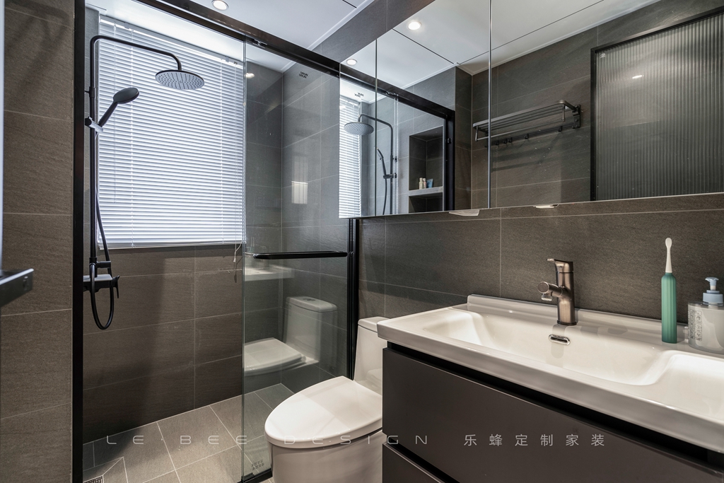 衛(wèi)生間采用了鏡面柜,既可以作為鏡子使用,又可以用來收納。右側(cè)還設(shè)計(jì)了一個(gè)開放式柜子,方便存放洗漱用品。水龍頭的設(shè)計(jì)非常隱蔽,增加了衛(wèi)生間的整體美感。