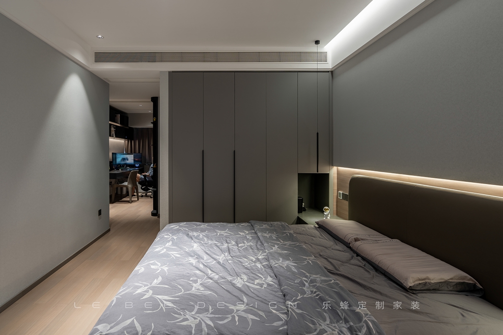 主臥使用了原木地板通鋪,主要使用線燈和射燈來照亮整個(gè)房間。灰色的背景墻下方設(shè)計(jì)了一條床頭射燈,床頭部分采用原木硬包裝飾,兩側(cè)的床頭還設(shè)計(jì)了多個(gè)充電孔,方便業(yè)主充電使用。