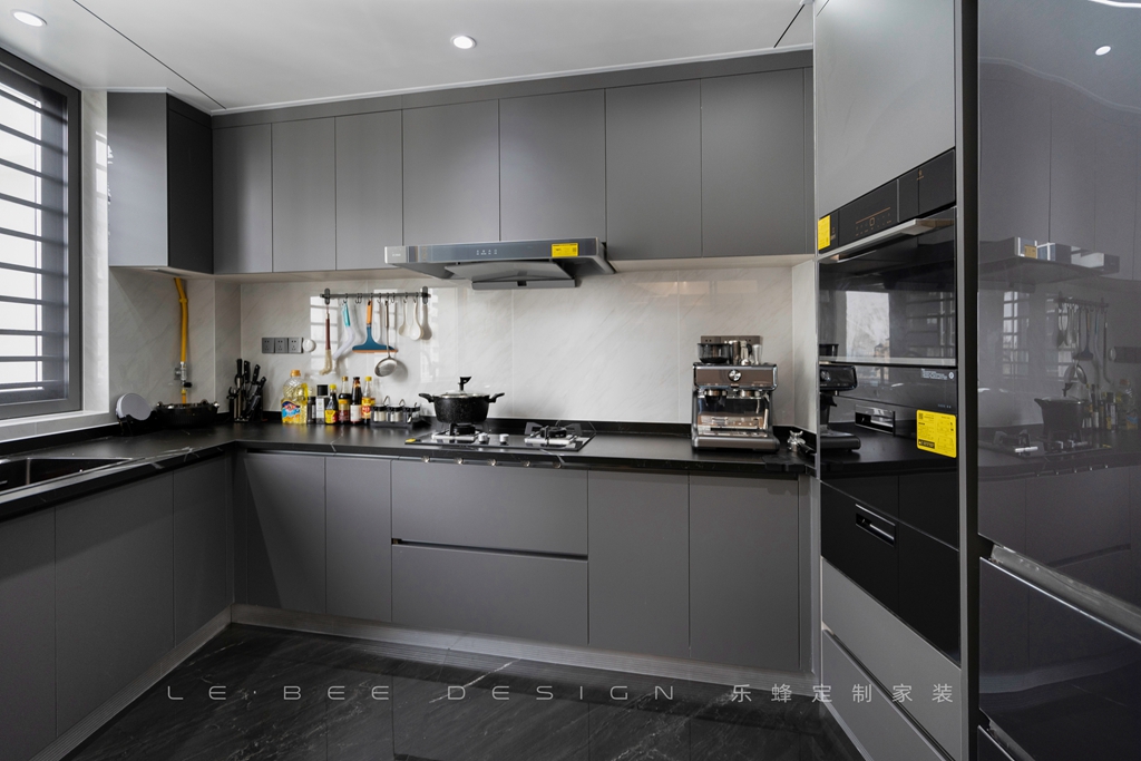 廚房的整體風(fēng)格以灰黑色為主,沒有主燈設(shè)計(jì),同樣采用黑色地板磚與客廳形成通鋪的效果。廚房采用回形設(shè)計(jì),功能區(qū)域明顯,使用起來更加方便,儲物空間也更為充裕。