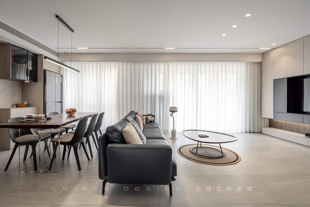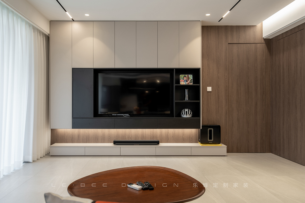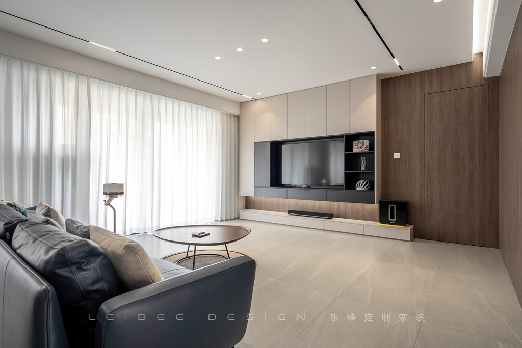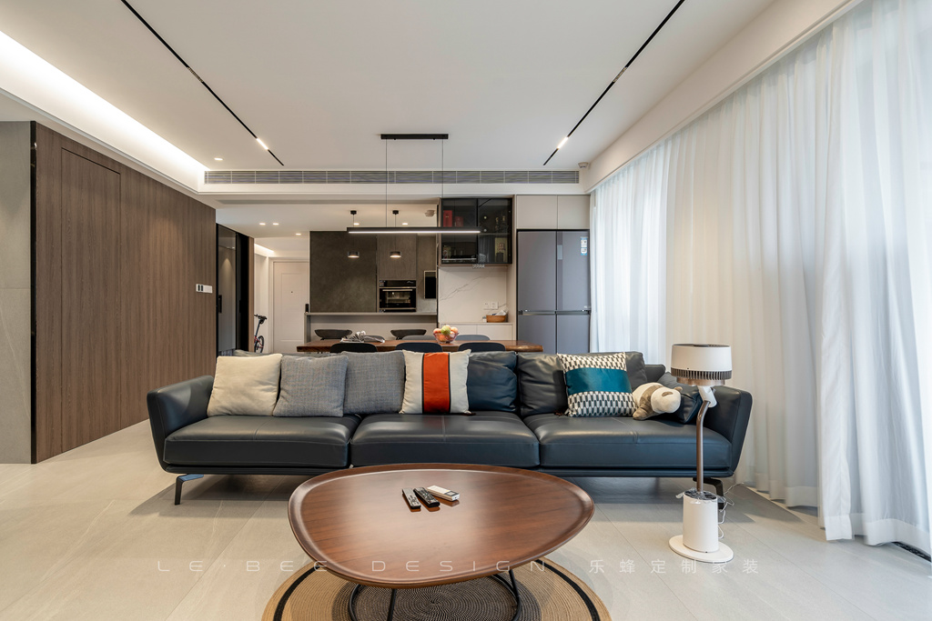超大的落地窗配以夢(mèng)幻的窗簾,沒(méi)有過(guò)多的頂燈,整個(gè)空間通透寬敞,唯有線燈、射燈照亮客廳。一張藍(lán)色的皮質(zhì)沙發(fā)搭配著布藝抱枕,展現(xiàn)出大氣與高尚的氛圍。木質(zhì)的小茶幾與黃黑色的圓形地毯相得益彰,就像是為茶幾量身定制的。原木門隱約間,將客廳與另一個(gè)世界連接起來(lái),關(guān)閉時(shí)與客廳完美融合。由淺色和深色調(diào)構(gòu)成的電視墻,既滿足了儲(chǔ)物需求,又方便觀看。懸浮設(shè)計(jì)和燈光的運(yùn)用更增添了神秘感。黑色的長(zhǎng)音箱,使得家人們?cè)谝黄鹩^看電視或欣賞音樂(lè)時(shí),音效更加出色。
