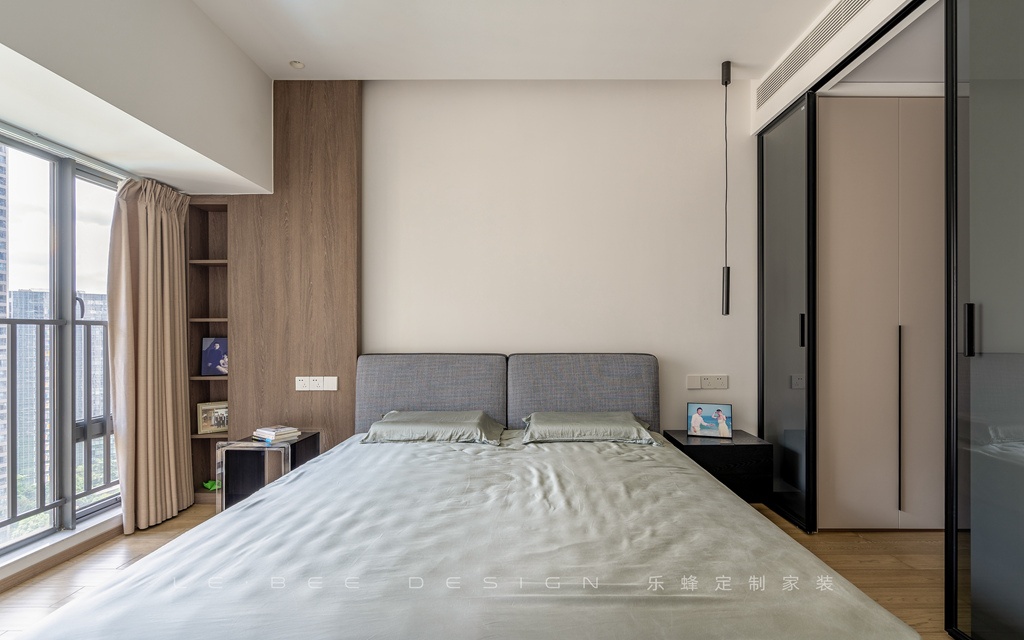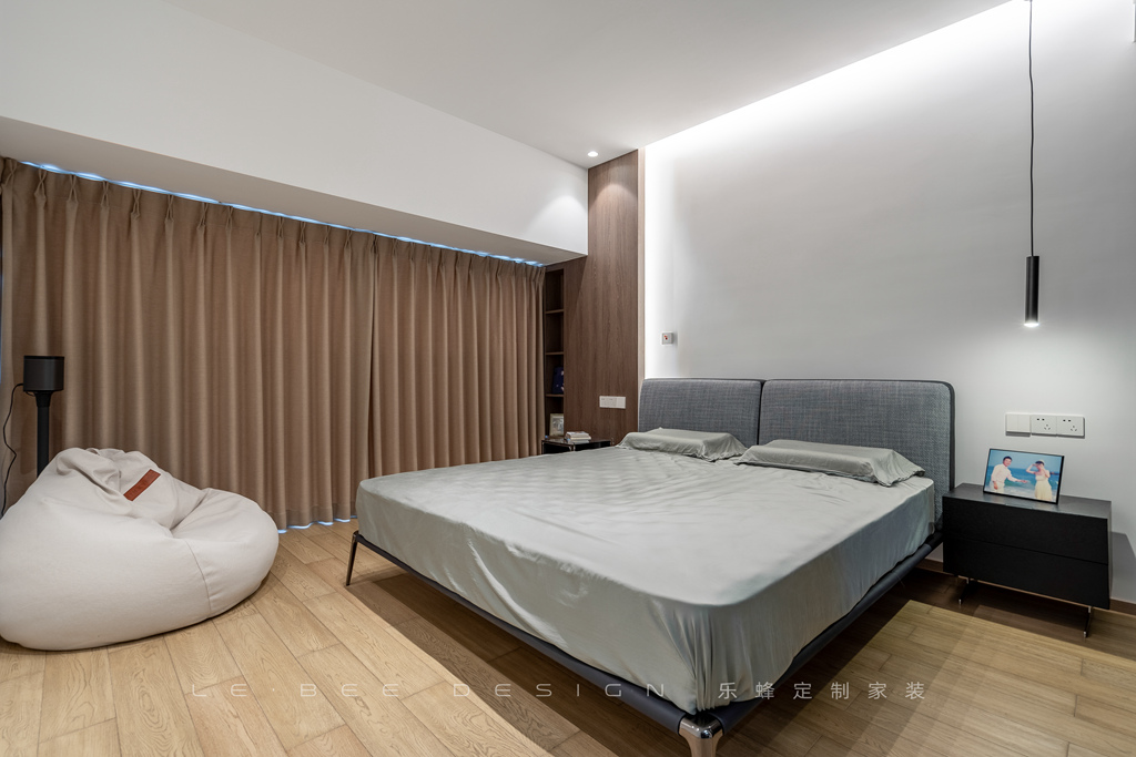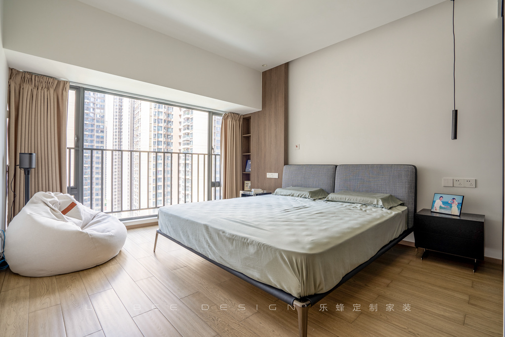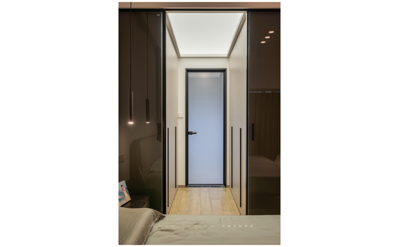 主臥室簡(jiǎn)約而溫馨,踏入此處,感受到來(lái)自原木底板的溫暖。綠色和灰色的搭配展現(xiàn)出舒適和高貴的質(zhì)感,兩側(cè)黑色簡(jiǎn)潔的床頭柜。在床上,你可以躺著看書(shū),或者坐在懶人沙發(fā)上聽(tīng)音樂(lè)。早上起床,與陽(yáng)光親密接觸。透明衣柜里擺放著成熟而端莊的西裝和外套,方便日常上班。推開(kāi)黑色的推拉門,走進(jìn)獨(dú)立的衣帽間,自由選擇合適喜歡的服飾,美美地出門與朋友聚聚。高級(jí)灰色的浴室干濕分離,設(shè)計(jì)師以右側(cè)為功能區(qū),更加方便。