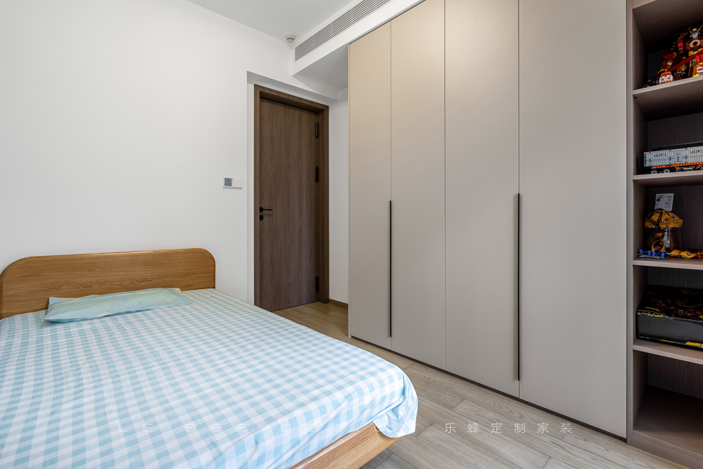 男孩的房間簡(jiǎn)約而溫馨,沒(méi)有過(guò)多的裝飾,一張?jiān)敬泊钆浜?jiǎn)潔的藍(lán)色被套,展現(xiàn)出男孩子的簡(jiǎn)約氣質(zhì),再加上一個(gè)現(xiàn)代簡(jiǎn)約的灰色衣柜,男孩房就這樣簡(jiǎn)單而充滿魅力地呈現(xiàn)在你眼前。