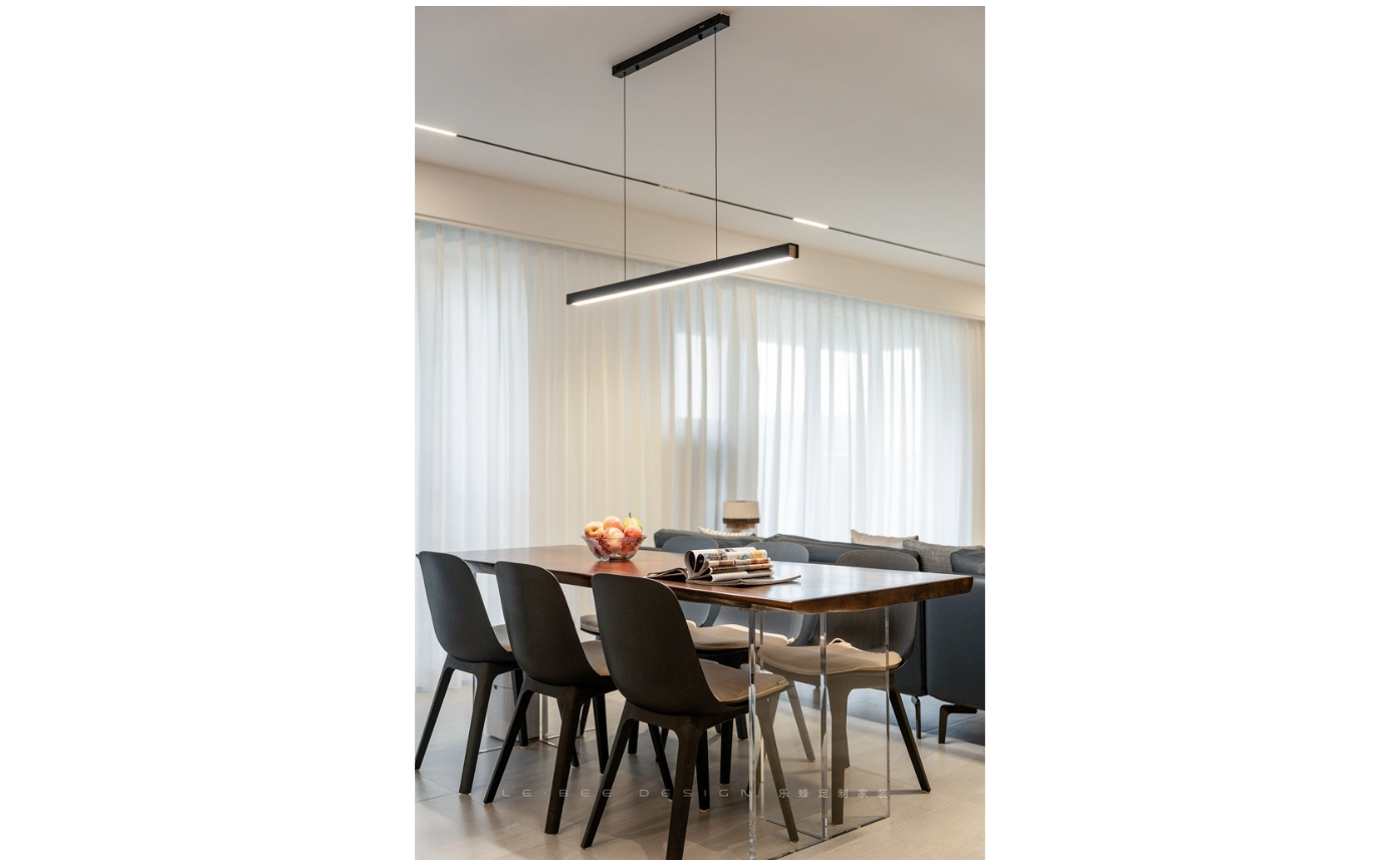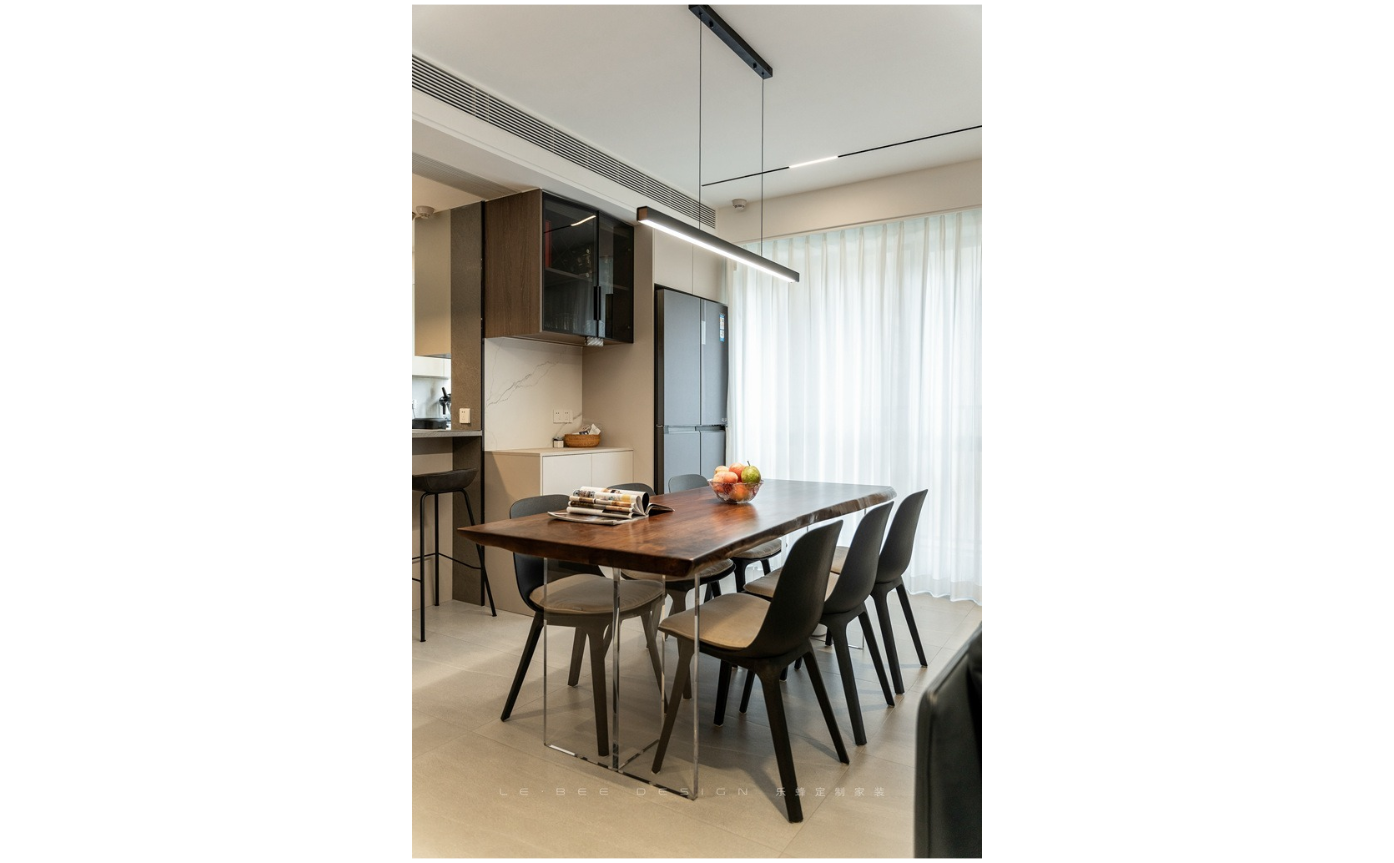 進(jìn)入與客廳相連的餐廳,你會(huì)驚喜地發(fā)現(xiàn)就餐也能有如此高尚的氛圍。一盞長(zhǎng)線燈垂掛在木質(zhì)餐桌上方,一家人在這一起就餐。孩子們?cè)诳蛷d看電視,大人們一起聊天,溫馨又幸福的場(chǎng)景展現(xiàn)眼前。在這里,閑暇時(shí)坐下來(lái),吃著水果看書(shū),也是一種別有風(fēng)味的享受。