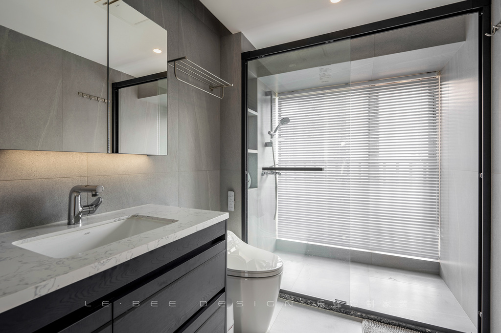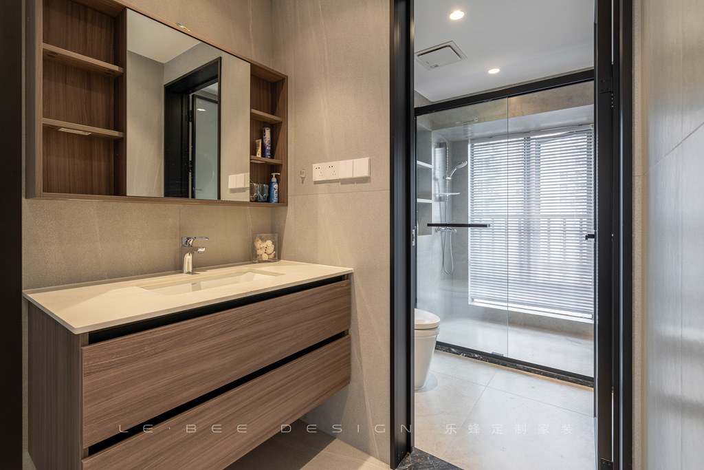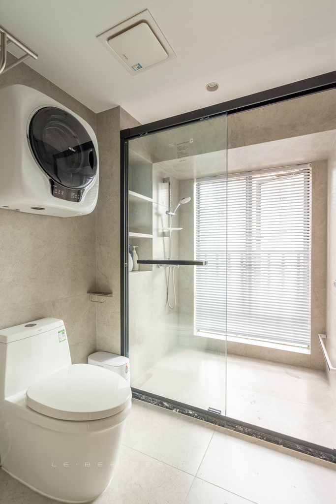 公共衛(wèi)生間對(duì)于多數(shù)家庭來(lái)說(shuō),使用頻率相對(duì)較高,使用人數(shù)也比較多,因此不僅需要考慮功能的完備性,還需要考慮使用的便利性。設(shè)計(jì)師采用掛墻式洗衣機(jī)來(lái)解決空間問(wèn)題,干濕區(qū)分離,濕區(qū)凹槽設(shè)計(jì)更便于洗澡需求的滿足。