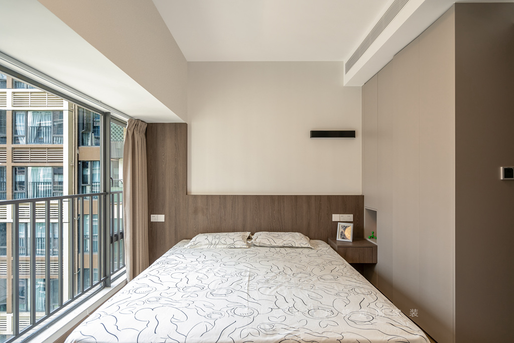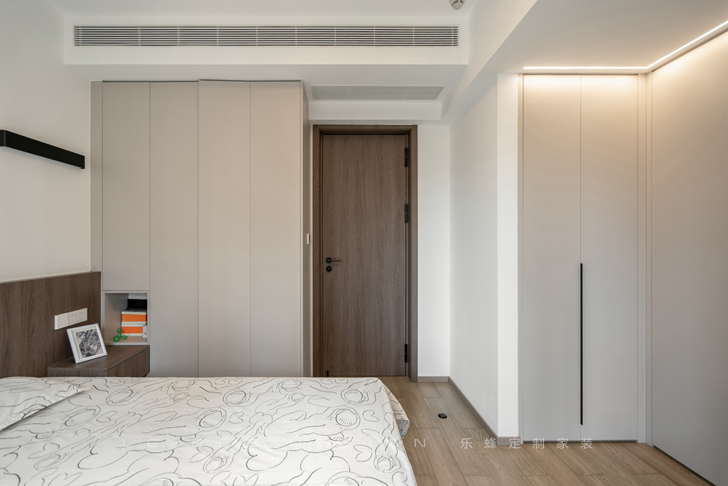 大部分家庭的長(zhǎng)輩對(duì)房間的要求較為簡(jiǎn)單溫馨,這間長(zhǎng)輩房以大量的原木材料營(yíng)造出溫馨的氛圍,原木材質(zhì)作為硬包材料,休息區(qū)簡(jiǎn)約雅致。