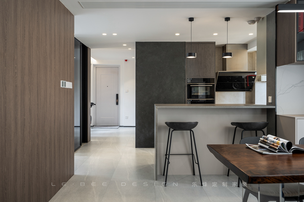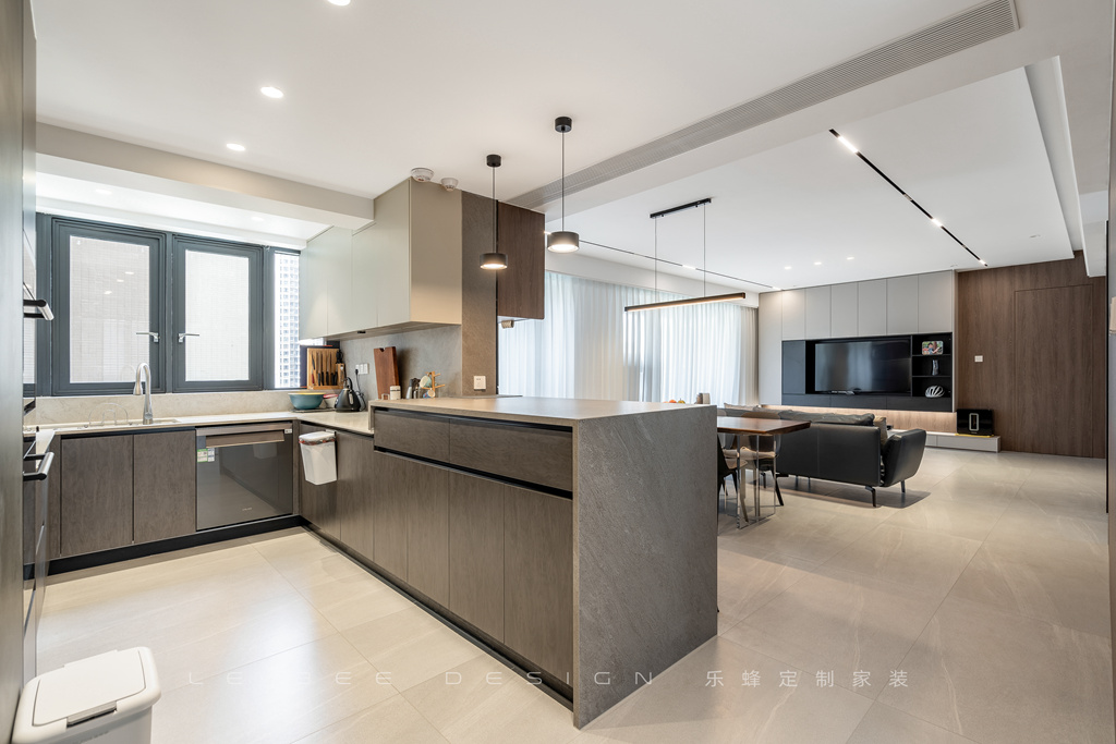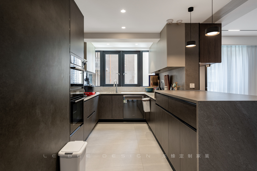 U型的開(kāi)放式廚房采用深色的木材、灰色和黑色元素,打造出一個(gè)高尚又簡(jiǎn)約的廚房。開(kāi)放式廚房便于家庭成員間相互協(xié)作,烹飪出美味佳肴。