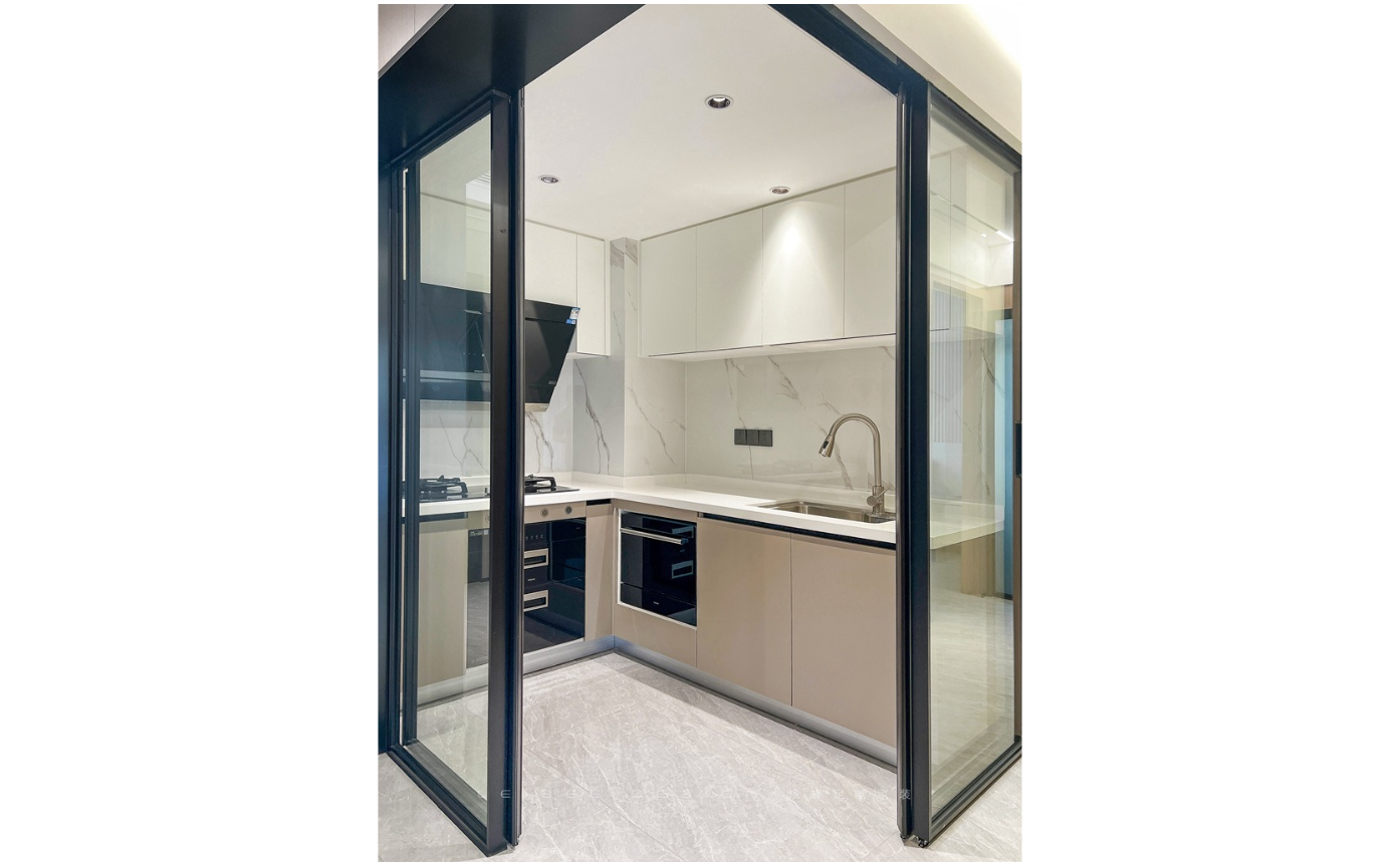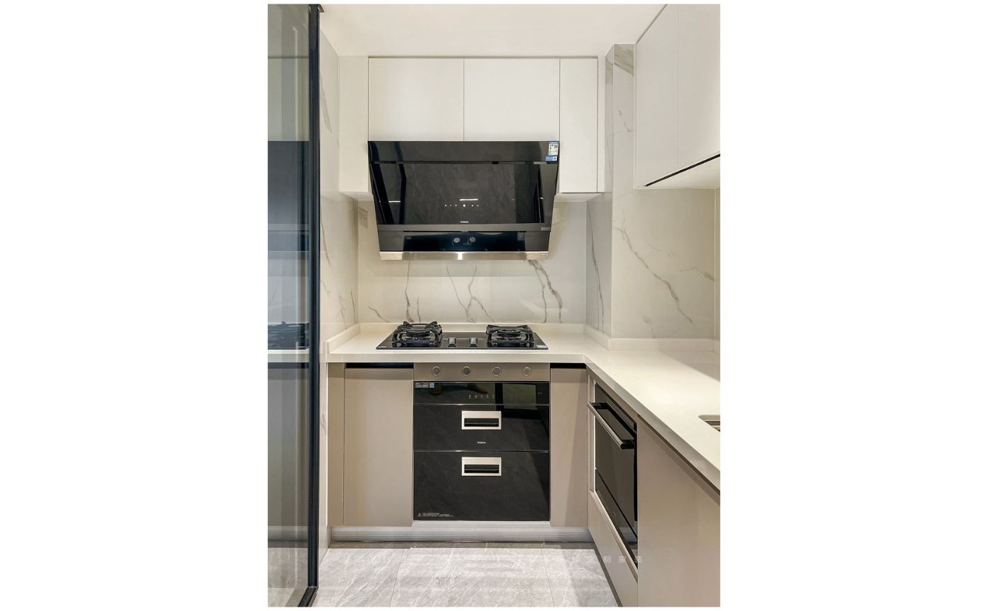 廚房部分,根據(jù)空間的限制,設(shè)計師采用了開放式L形廚房的設(shè)計,同時利用黑寬玻璃推門,讓廚房與其他區(qū)域相隔。