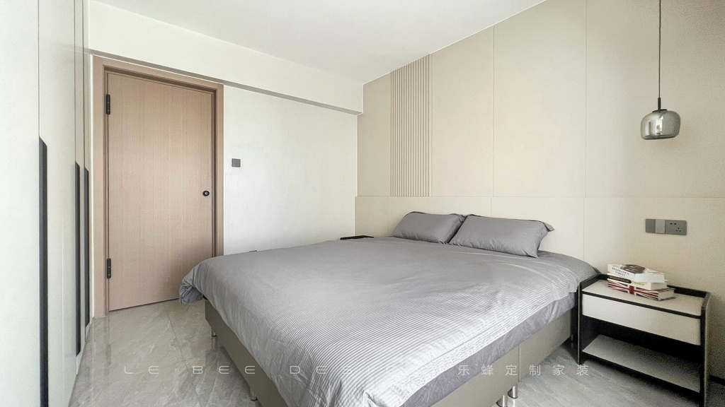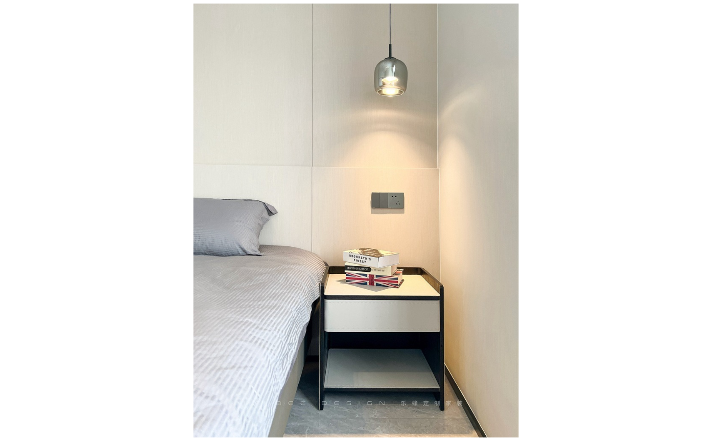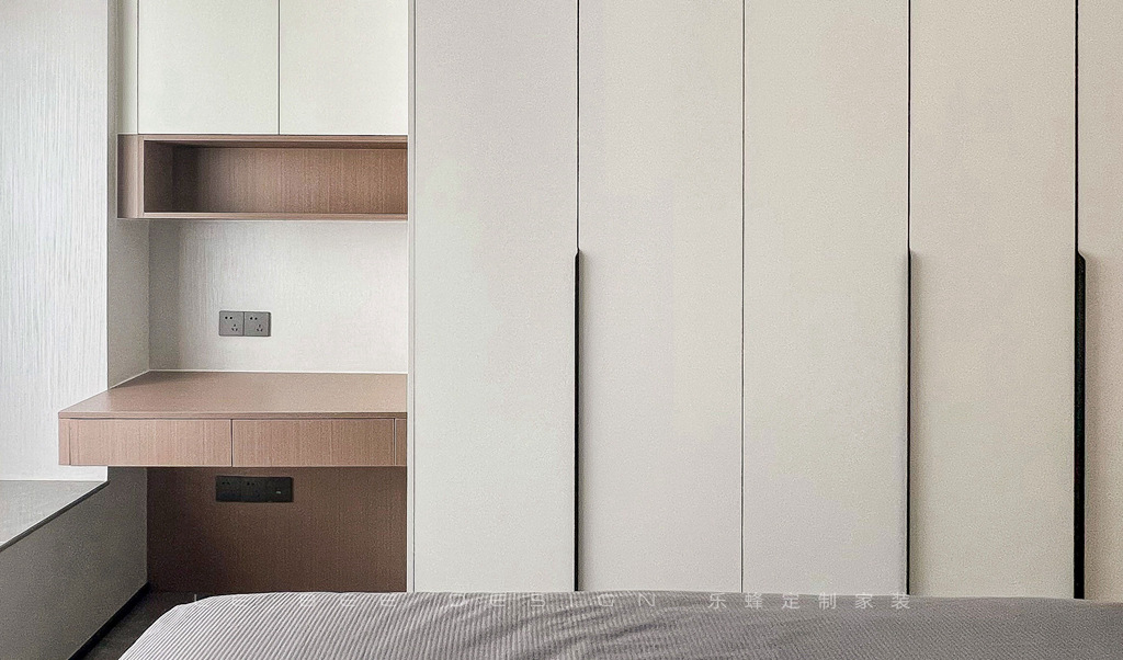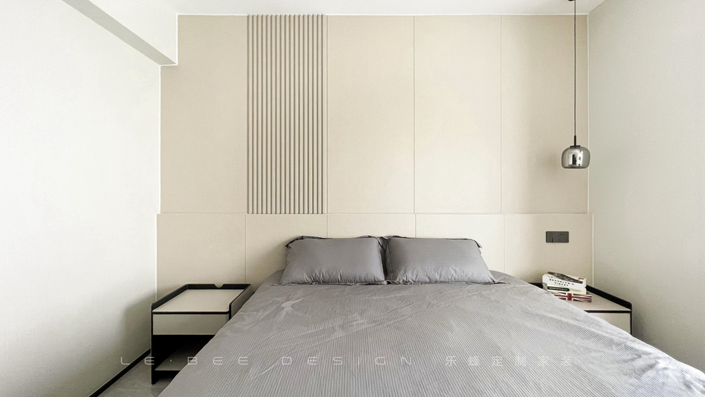 杏色的護(hù)墻板、格柵和床頭硬包為空間增添了層次感,床長1.8×2.15米,既溫馨又舒適。黑白相間的床頭柜簡潔而高級,配上床頭的暖光吊燈,為臥室營造出更濃厚的氛圍。床尾設(shè)置了一大排衣柜和懸空式的梳妝桌,既滿足了業(yè)主的儲物需求,又可用于日常化妝或辦公。