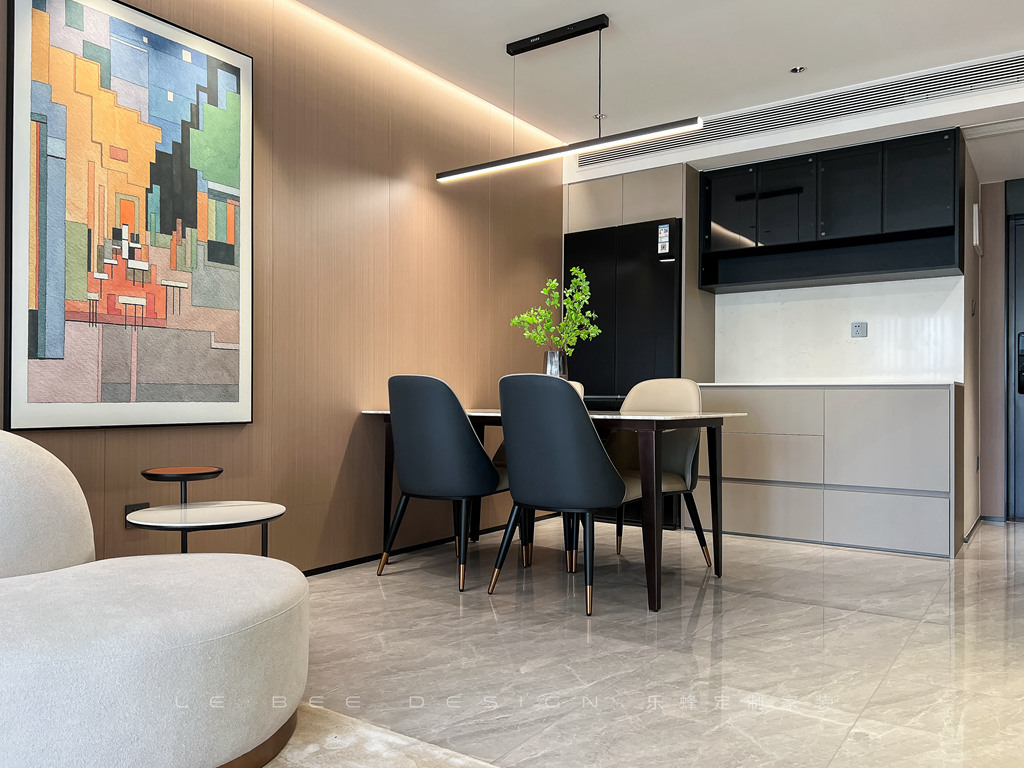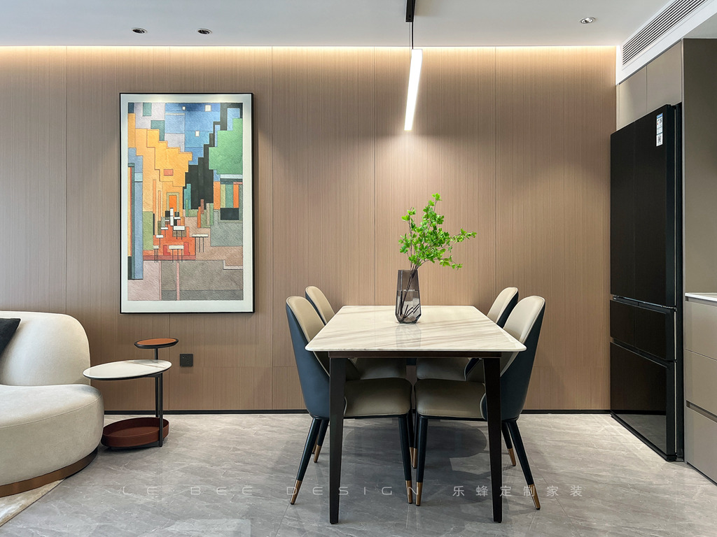餐廳部分,簡約而高級,大理石餐桌與藍(lán)色皮質(zhì)軟座的餐椅使就餐更加舒適自然。長款餐桌搭配長線吊燈,燈光照在綠植上,使整個空間充滿了生機(jī)勃勃的感覺。淺灰色與黑色相搭配的餐邊柜,既高級又不失靈動感,黑色的冰箱嵌入其中,黑色的高柜可用來放置紅酒或裝飾品,增加了空間的神秘感。