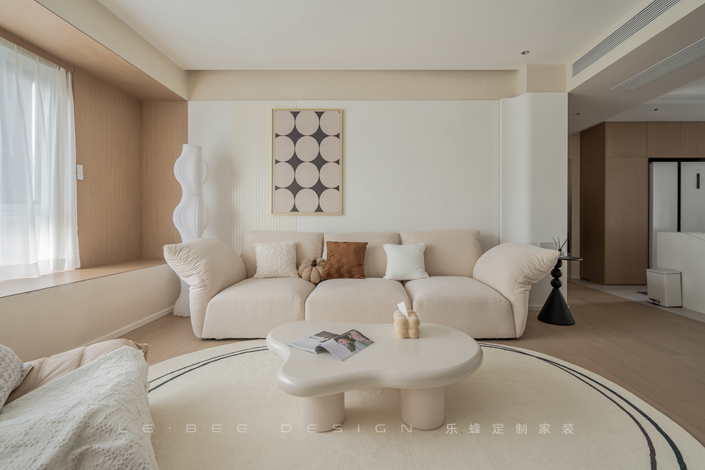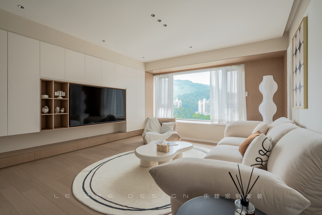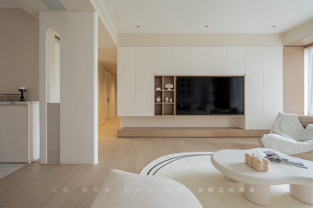 電視柜設計巧妙還原,充滿了收納的便利性。電視嵌入在柜子中,周圍的裝飾隔板和原木電視地柜相得益彰,呈現(xiàn)出一種簡約而又不失品質(zhì)的感覺。客廳就像一片濃濃的奶油海洋,散發(fā)著慵懶而溫馨的氣息。沒有主燈的設計讓原木底板更加突出,營造出一種自然而舒適的氛圍。飄窗與夢幻窗簾的融合,讓每一次休憩都成為一場輕松的享受。