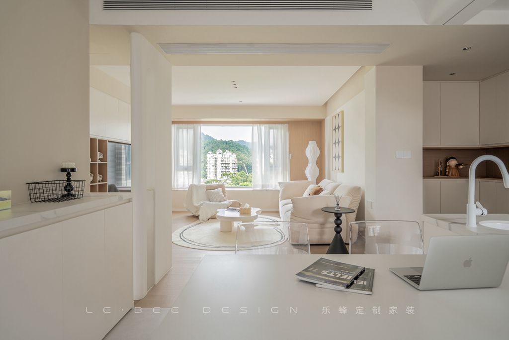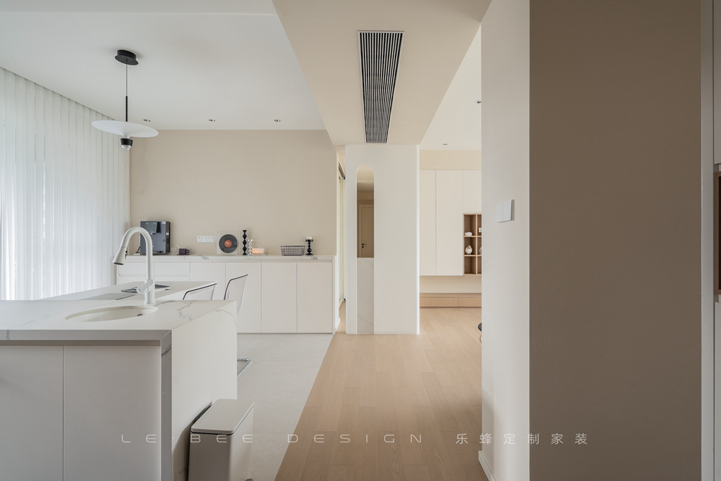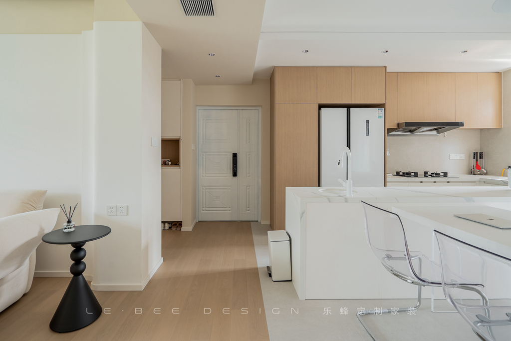 入戶設計簡約而溫馨,就像一個溫暖的擁抱。白色的入戶門與整體風格相得益彰,給人一種舒適的感覺。右邊的鞋帽收納柜讓回家后的換鞋和放包動作變得輕松自然,同時打開溫馨的燈光,瞬間營造出賓至如歸的氛圍。往前走是一道屏風,其中的弧型空洞透過朦朧的視線勾勒出走廊的美感。
