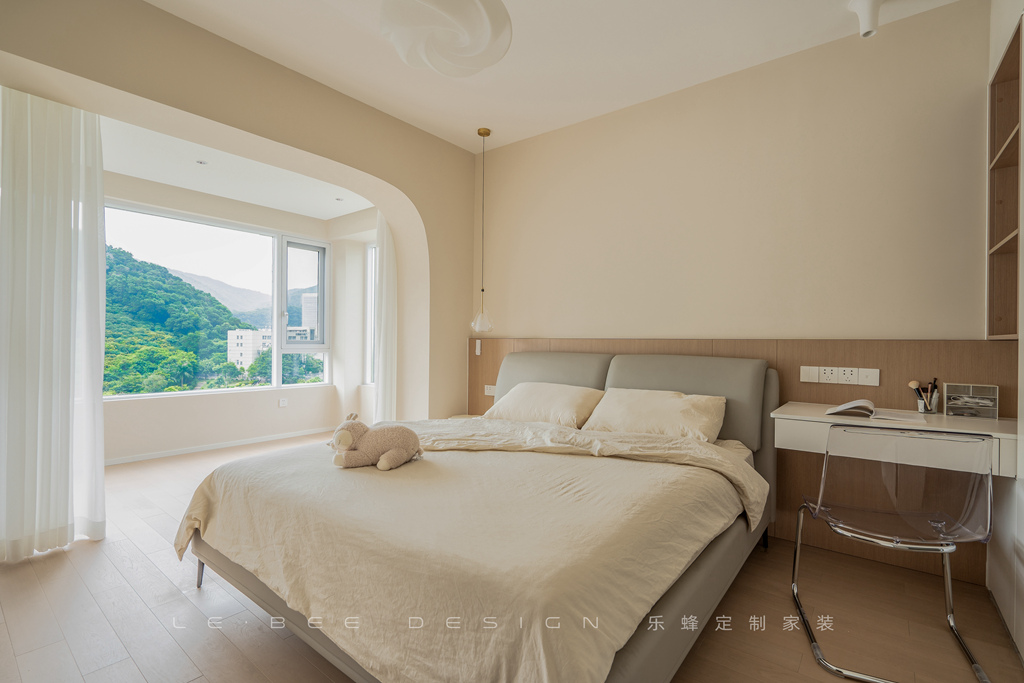 與陽臺區(qū)分開的設計給主臥帶來了一個超大的觀賞陽臺,寬敞明亮的大面窗戶讓陽光充滿整個房間。弧型的隔斷和夢幻的簾子營造出一種浪漫的氛圍,同時在陽臺上設計的衣柜使臥室更加整潔簡約,充分利用了空間。通往主衛(wèi)的門兩側(cè)設計的隱形嵌入式衣柜簡潔實用,就像是一個安靜的小角落,既方便了衣物的放置,又增加了空間的美觀度。