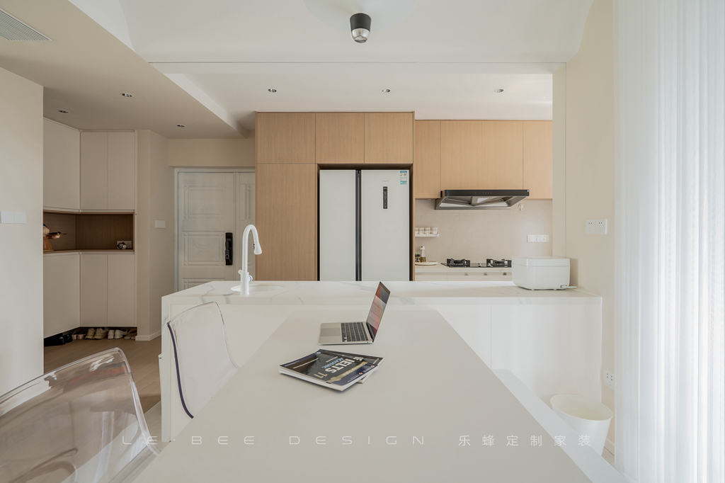 大理石導臺,白色洗手池和多功能水龍頭。白色冰箱嵌入原木廚柜,烹飪區(qū)有獨特的地毯吸油污讓空間更干凈整潔。