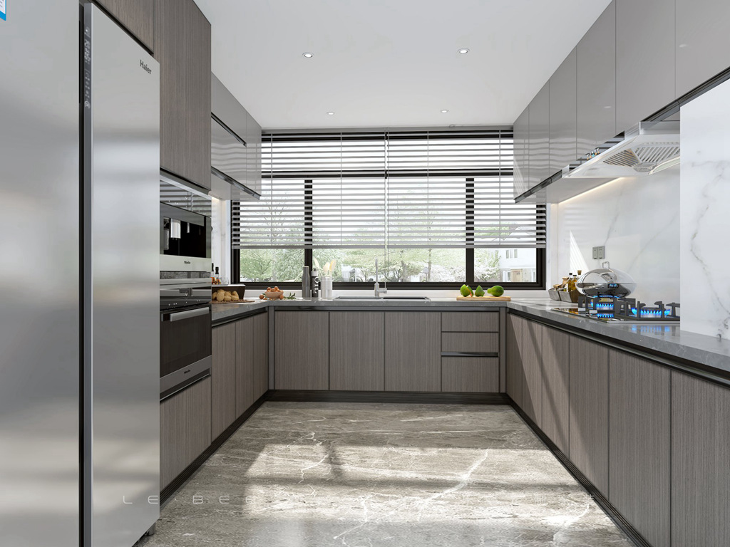 廚房回形設計,無主燈,百葉窗設計光線可調節更通透,電器嵌入柜中,柜門設計隱藏拉手更方便。