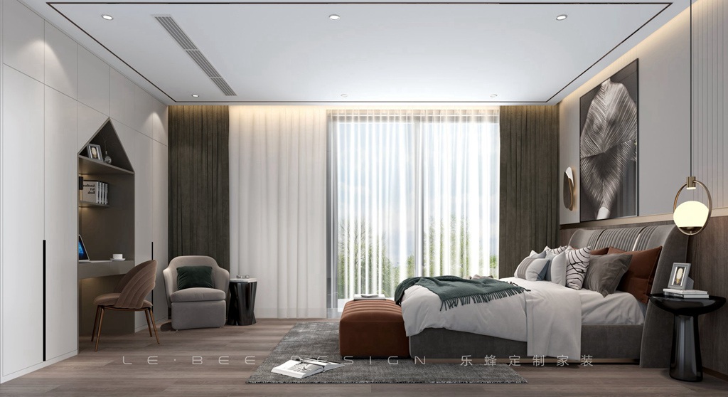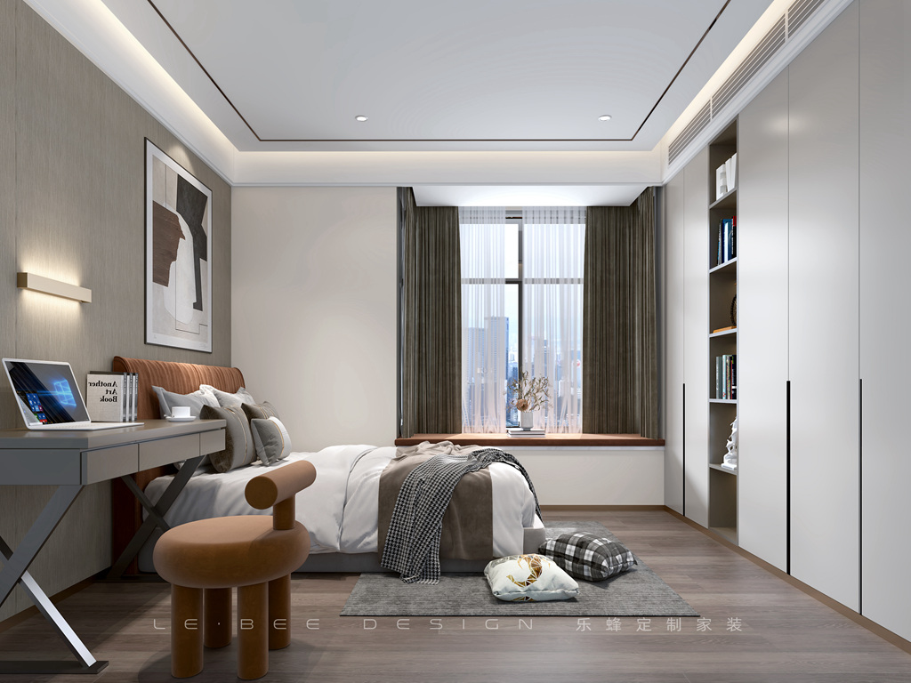 柜子與桌椅設計為一體化將空間更整體化,灰色遮光窗簾搭配隱私簾簡單而高級,休息區設計床位凳,搭配床頭吊燈舒適而溫馨。懸浮頂設計,簡單的桌子搭配棕色椅子。休閑區以灰、棕、白為主,飄窗設計可以坐在此處看窗外世界,衣柜一門到頂,黑色簡約拉手設計簡約大氣。