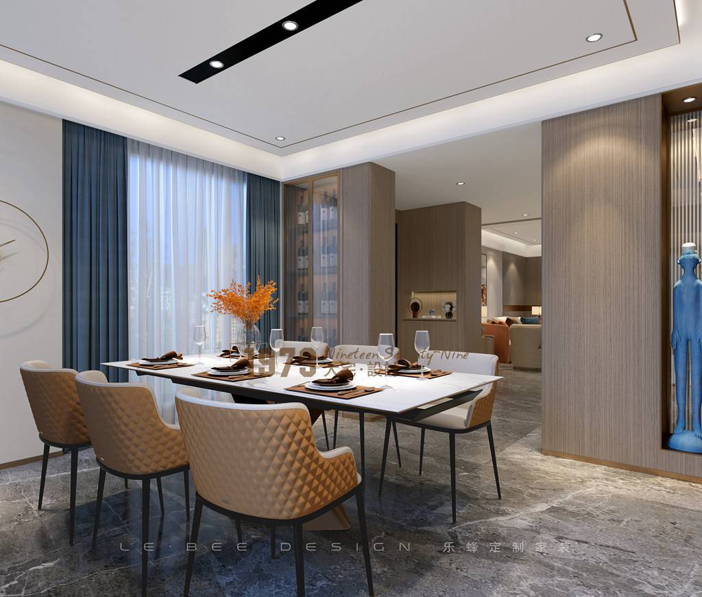 餐廳懸浮頂,射燈設計空間氛圍感超強,使用巖板餐桌搭配橙色皮質餐椅,用藍色的窗簾更豐富。