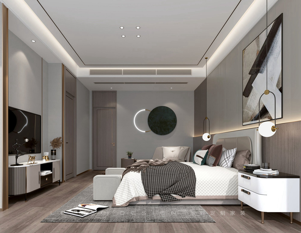 懸浮頂設計,原木地板通鋪,灰色地毯設計更高級,床頭掛兩個圓吊燈,原木硬包延長搭配線燈。床尾設計電視光影區業主躺著就可以光影。主衛干濕分離設計浴缸,玻璃門做干濕隔斷。鋪黑色亮面地磚、貼白磚黑白高級感。懸空雙人洗漱臺設計臺上盆,懸空洗漱收納柜,隱藏式水龍頭搭配大面LED鏡面,高級時尚。衣帽間透明玻璃門設計一門到頂,金色寬包邊搭配原木色滿滿的高級感。