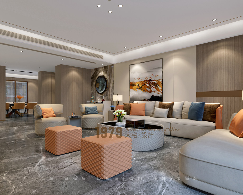 客廳設計硬包,通鋪灰黑色地磚,沙發背景用兩處景裝飾,一處是掛畫,一處則是巖板和輕奢金屬墻飾 。沙發用橙、藍、棕三色來點綴灰色布藝沙發和皮質單人椅,奢華與大氣的沒展現的玲玲盡致。懸空電視背景墻采用爵士白紋理,看起來簡約大氣。