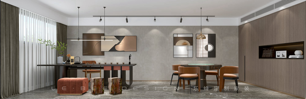 棋牌茶室設計在一起,都搭配不同意境的掛畫裝飾,一邊是優雅清閑的飲茶區,黑色茶桌、橙色椅子、圓木墩搭配長吊燈,另一邊是棋牌區一家人圍坐在一起打打麻將好是悠閑。還設計了一排儲物收納柜存放茶葉很適合。推開玻璃門進入到光影廳,懸浮的吊頂設計將幕布隱藏到吊頂中,投影儀設計觀影效果更佳,一家人可以盡情地享受光影時間。