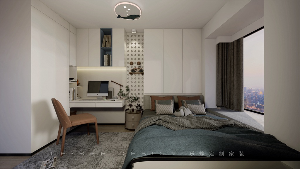 小孩房灰綠白搭配,地毯床單有質感。衣柜桌椅一體化,貼墻省空間。懸浮桌洞洞板,趣味空間展。