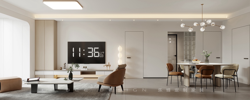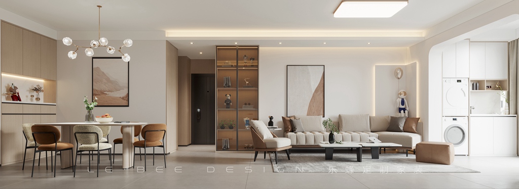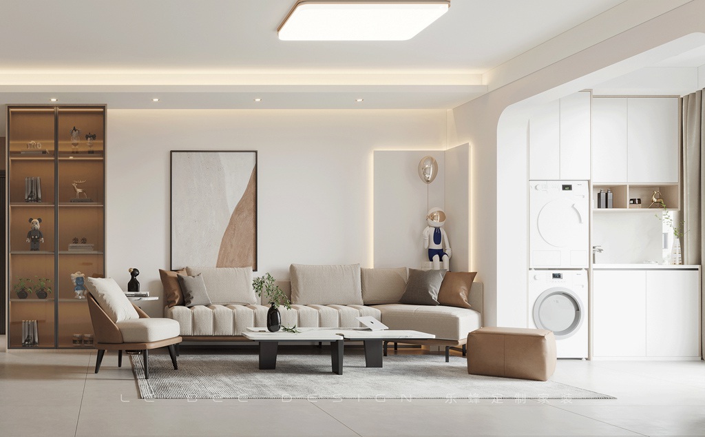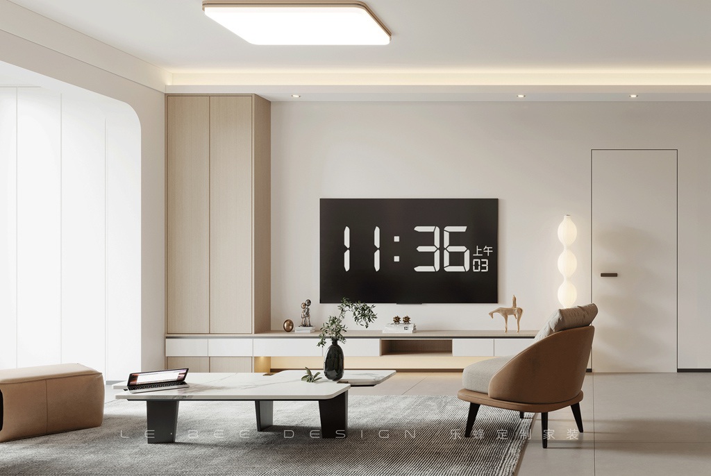 客廳地柜懸空柜,簡單電視墻,凸顯純白和諧。落地燈帶溫柔陪伴,沙發區柜裝點亮。墻面掛畫,角落燈帶、小人意境十足。