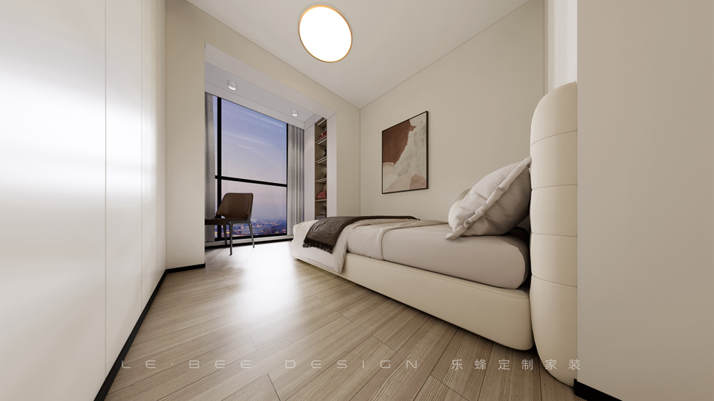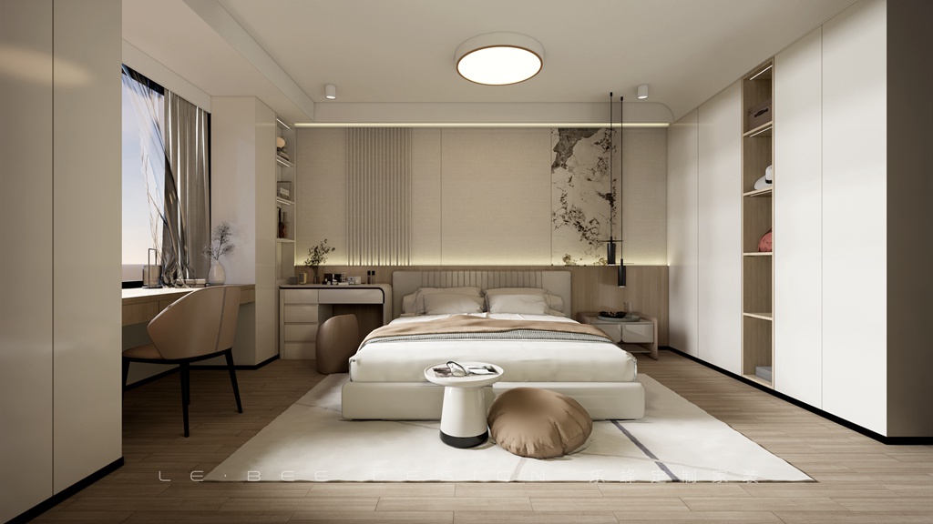 主臥木地通鋪,墻裝格柵、巖板裝點。床頭燈飾溫柔柔,內嵌隔板收納物品。窗邊懸空辦公桌,陽光灑滿心。