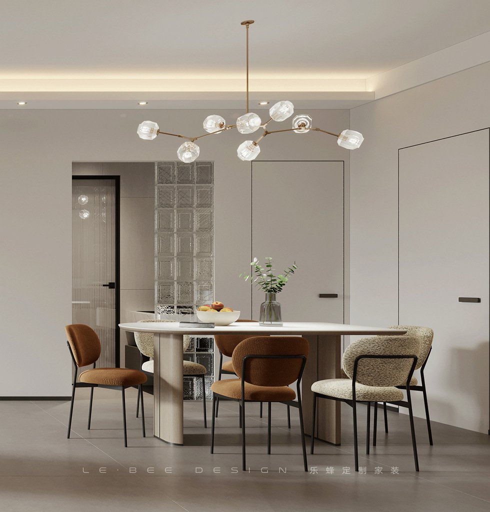 餐廳與北歐吊燈舞動時尚,巖板餐桌角,橢圓塑造優雅。綠植點綴餐邊柜,空處燈帶添生機,玻璃磚墻收口不露痕。美縫與墻齊聲和諧,美觀又穩固。