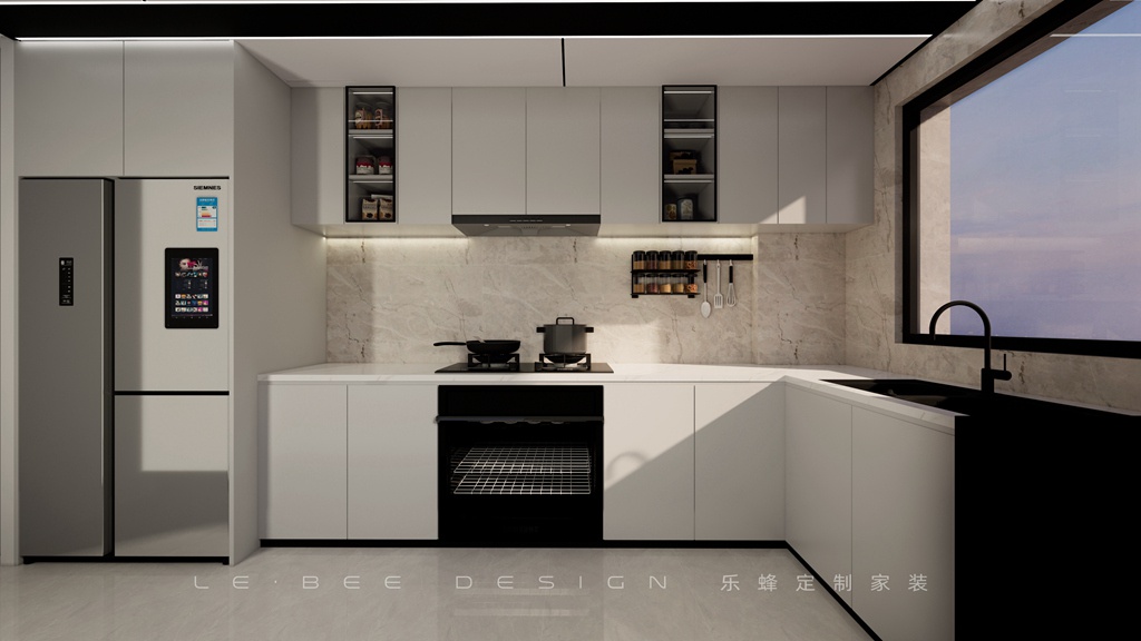 廚房如黑白鍵盤,窗戶一掃即凈,光影溫潤如春。電器幽身櫥柜,齊整呈一致。大單槽,顏值在線,方便實用兩全。烹飪區的壁掛式置物架,廚具井然有序。