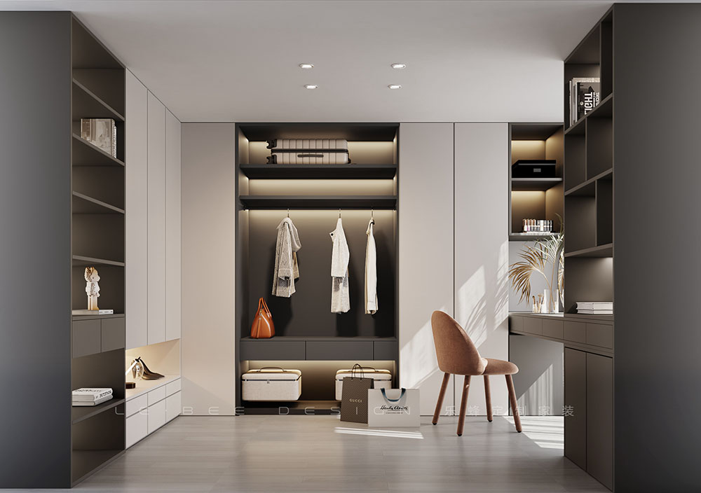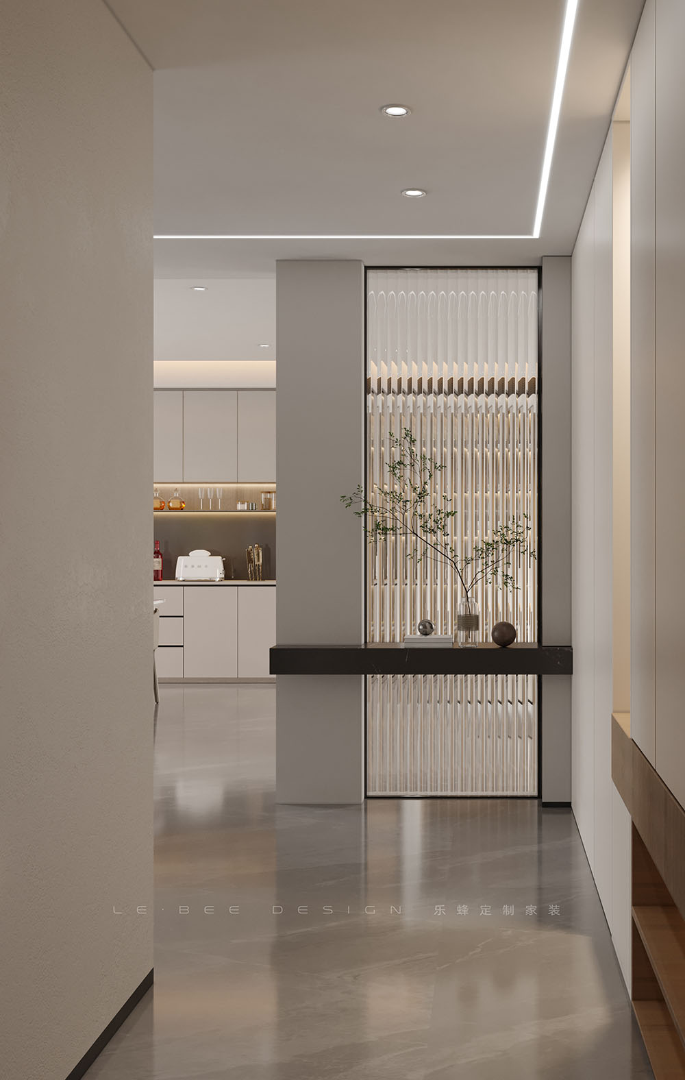 玄關(guān)作為客廳的屏風(fēng)做過渡區(qū)域,突出了一個展示臺,擺放小擺件、增加一個回家的氛圍感,玄關(guān)柜可以整體化設(shè)計,隱藏式柜門美觀大氣簡潔,方便掛衣服或放置常用物品,底部懸空可放置掃地機(jī)器人和拖鞋。增加感應(yīng)燈帶可營造氛圍,同時提供照明,方便取鞋換衣。