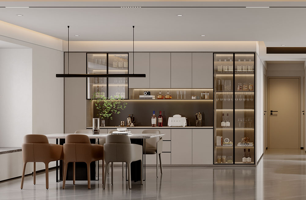 開放式餐廳設(shè)計偏好簡潔,功能性強(qiáng)的餐桌能夠應(yīng)對日常需求,同時賦予空間以自由和寬敞。米白和灰色的色調(diào)構(gòu)成了餐廳的溫馨背景,營造出一個輕松用餐的環(huán)境。為增添設(shè)計感,中間設(shè)置了別致的隔斷開放格,不僅劃分了空間,還保持了開放感。設(shè)計師精心規(guī)劃了一側(cè)的酒柜,搭配玻璃柜門,增強(qiáng)了空間的通透感,同時為整體設(shè)計注入了輕盈的氛圍。這一簡約而實(shí)用的設(shè)計理念,不僅注重美觀,更重視舒適和實(shí)用性。