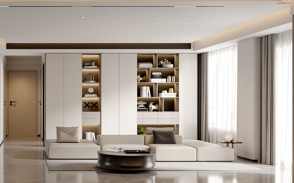 沙發(fā)區(qū)域的背景墻采用淺色調(diào)的收納柜,簡潔的線條和干凈的造型,設(shè)計開放格的同時,在墻面上巧妙嵌入的燈帶不僅為夜晚提供溫馨的照明效果,同時也作為裝飾點(diǎn)綴整個墻面,使得簡約之中不失精致感。