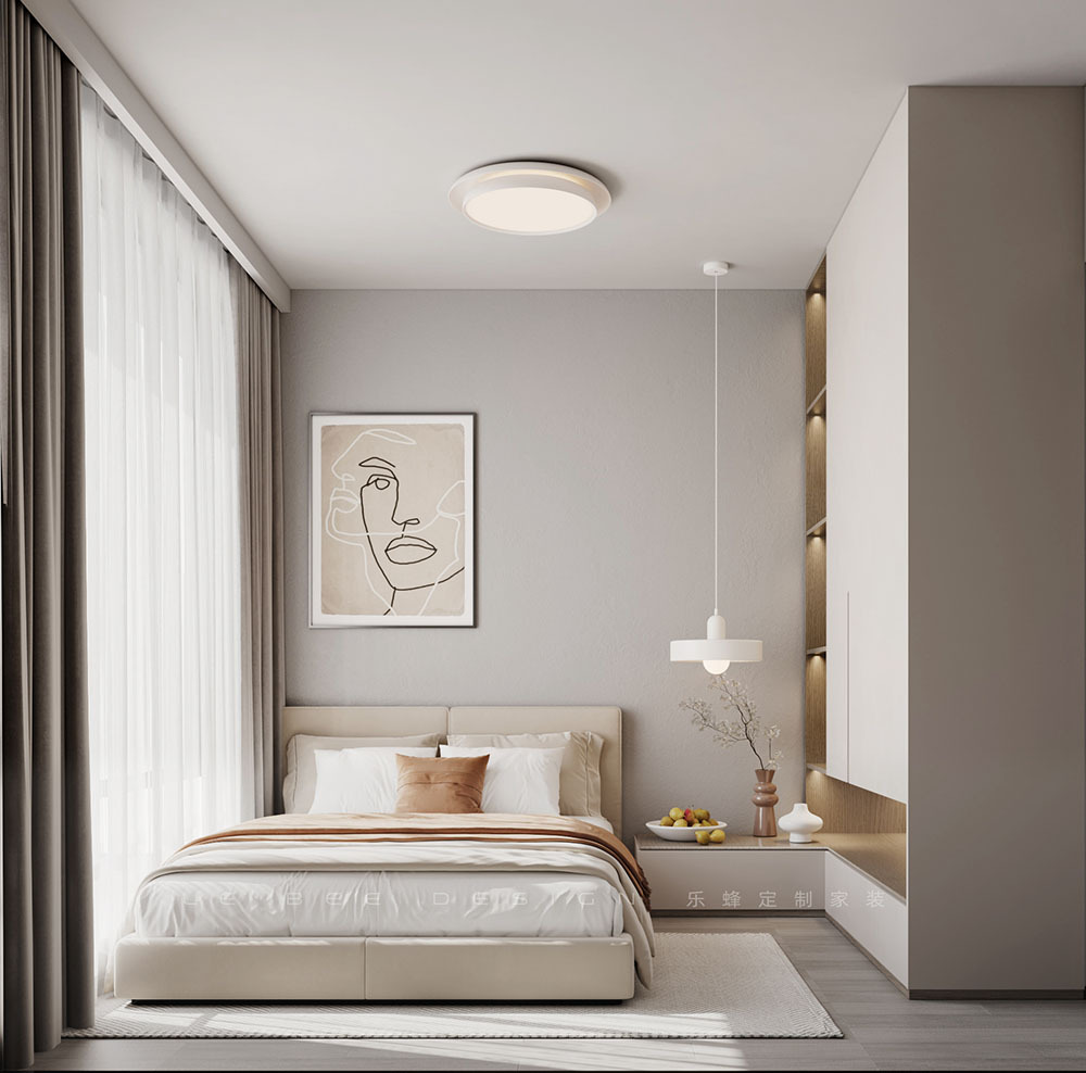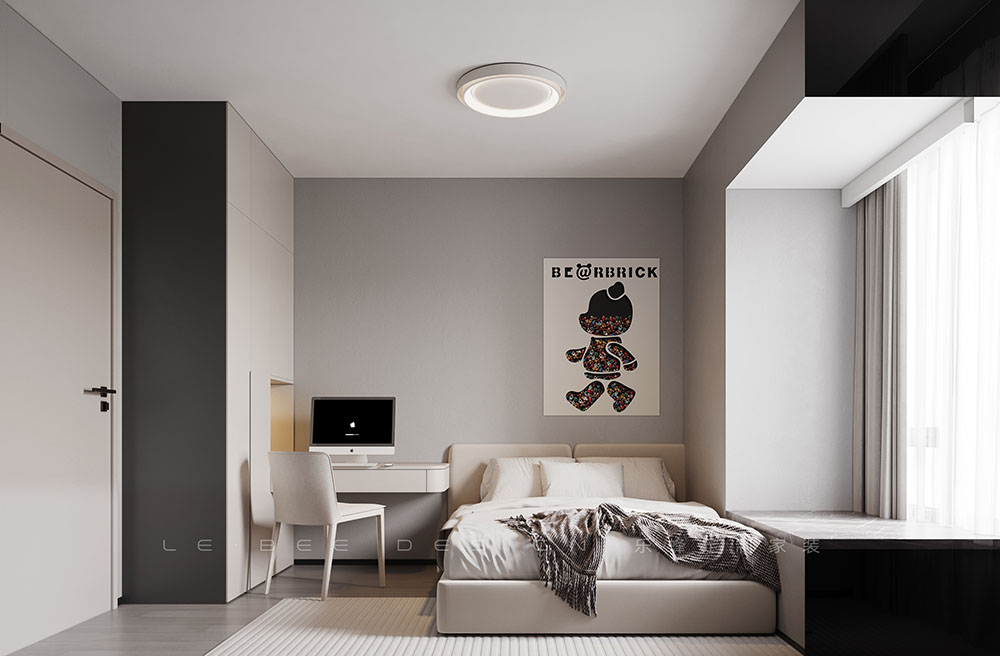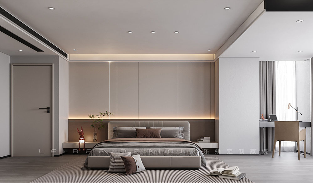 臥室設(shè)計考慮了存儲、美觀與功能性,木格柵和木飾面設(shè)計增添了收納空間,內(nèi)嵌燈帶優(yōu)化了光線。開放格和隱藏?zé)艄庹宫F(xiàn)了奢華細(xì)節(jié),簡易的花瓶裝飾更增添了一抹生活情趣。辦公區(qū)則布局在右方,一張簡易的辦公桌讓居住者在此辦公或休閑,充分利用空間。床采用米白色成品床墊,輕松營造出舒適的睡眠環(huán)境。