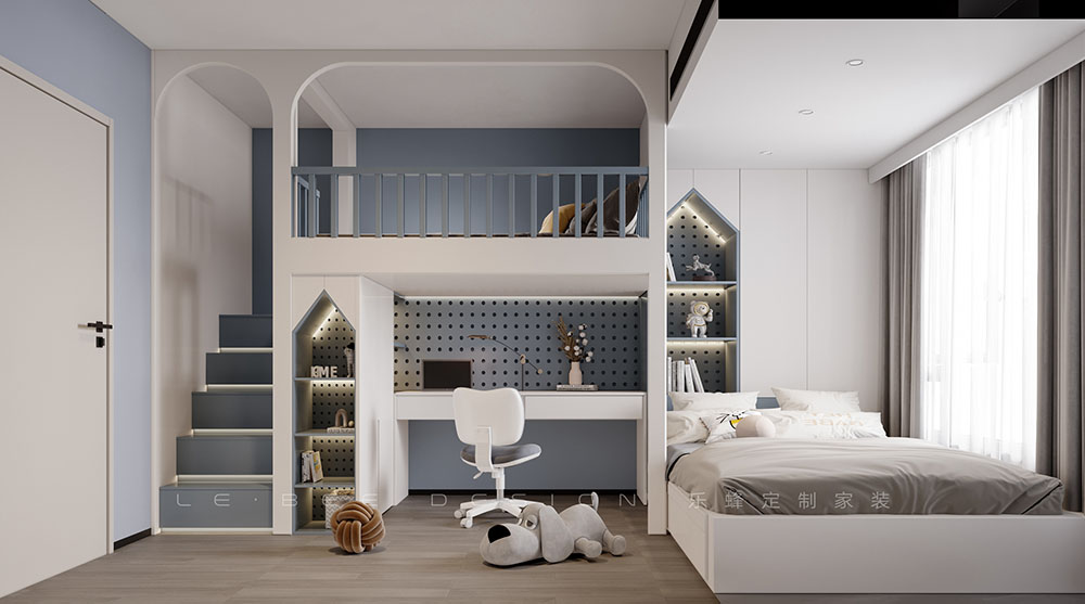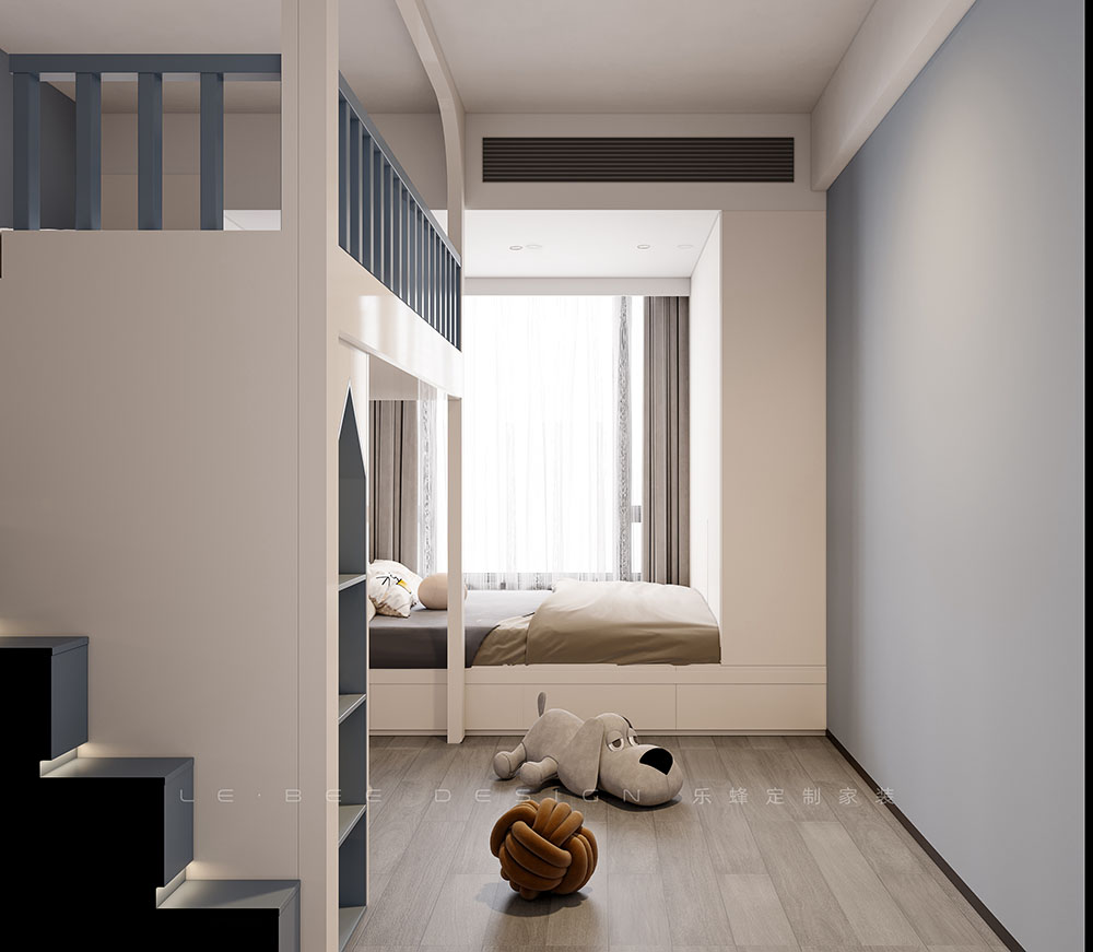 男孩房的設(shè)計藍(lán)色基調(diào)結(jié)合流行的太空元素,加上黃色的點(diǎn)綴,無疑激發(fā)了孩子們對探索宇宙的好奇心和熱情。吊椅的設(shè)計既有趣,又能提供一個安靜的閱讀角落,這是一處非常好的設(shè)計點(diǎn)。暖色調(diào)的設(shè)計配合衣柜和書桌的布局,改變了傳統(tǒng)兒童房的印象,為孩子提供了一個舒適且富有個性的空間。這樣的布局不僅滿足了孩子的日常需求,同時也能激發(fā)他們的觀察能力和創(chuàng)造力。另外,讓單人床獨(dú)立而不是傳統(tǒng)的上下鋪設(shè)計,也是體貼孩子的一種方式,讓他們有更自由的活動空間和更個人的隱私區(qū)域。